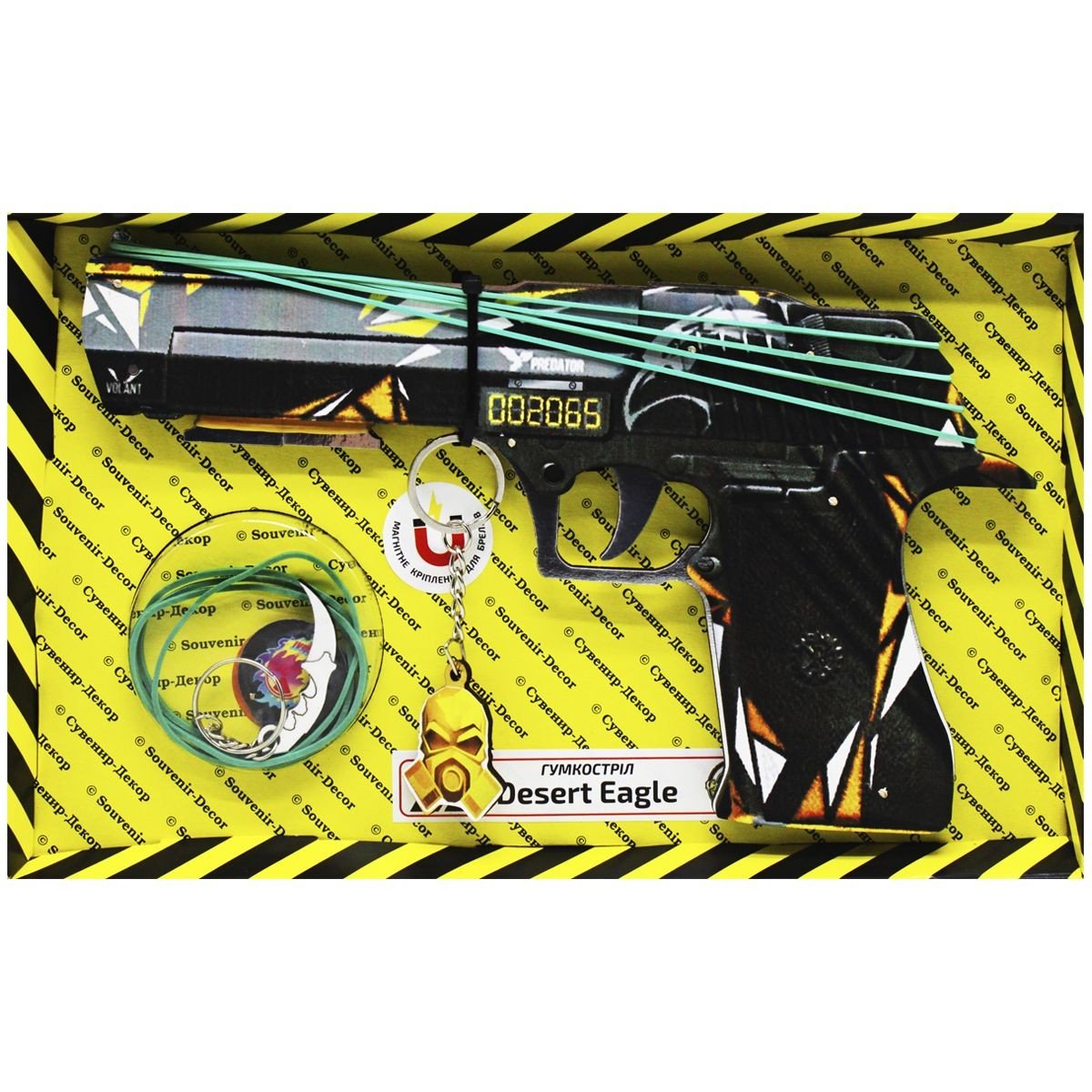 Бренд: Сувенир-Декор Упаковка: Коробка Колір: Різнобарв'я Вага з упаковкою: 320 г Габарити в упаковці: 4 x 27 x 17 см Габарити без упаковки: 2 x 25 x 13 см Країна виробник: Україна Матеріал: Дерево Комплектація: Пістолет, резинки для стрільби, 2 брелоки та наліпки