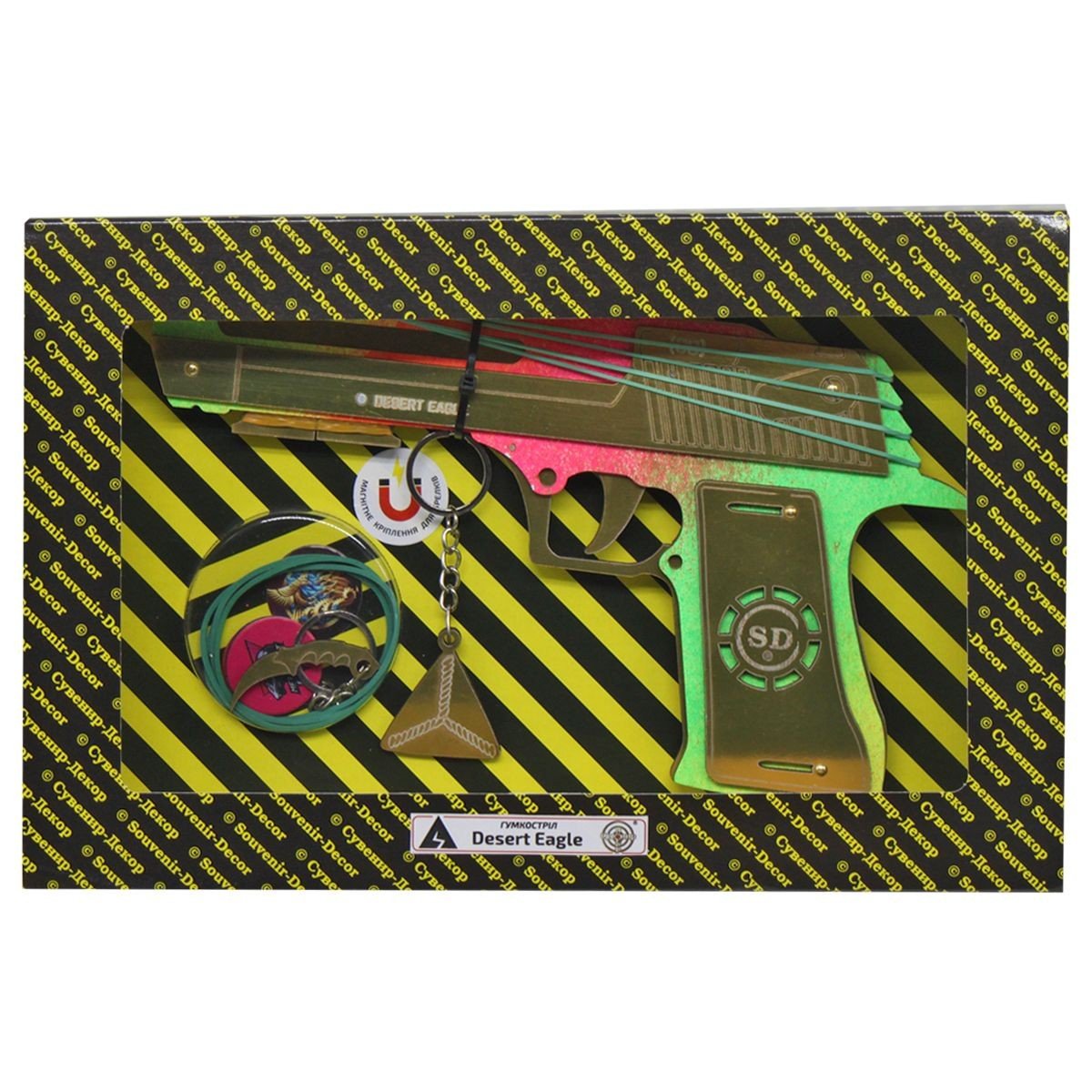 Бренд: Сувенир-Декор Упаковка: Пакет Колір: Різнобарв'я Вага з упаковкою: 320 г Габарити в упаковці: 4 x 27 x 17 см Габарити без упаковки: 2 x 25 x 13 см Країна виробник: Україна Матеріал: Дерево Комплектація: Пістолет, резинки для стрільби, 2 дармовиса та та наклейки