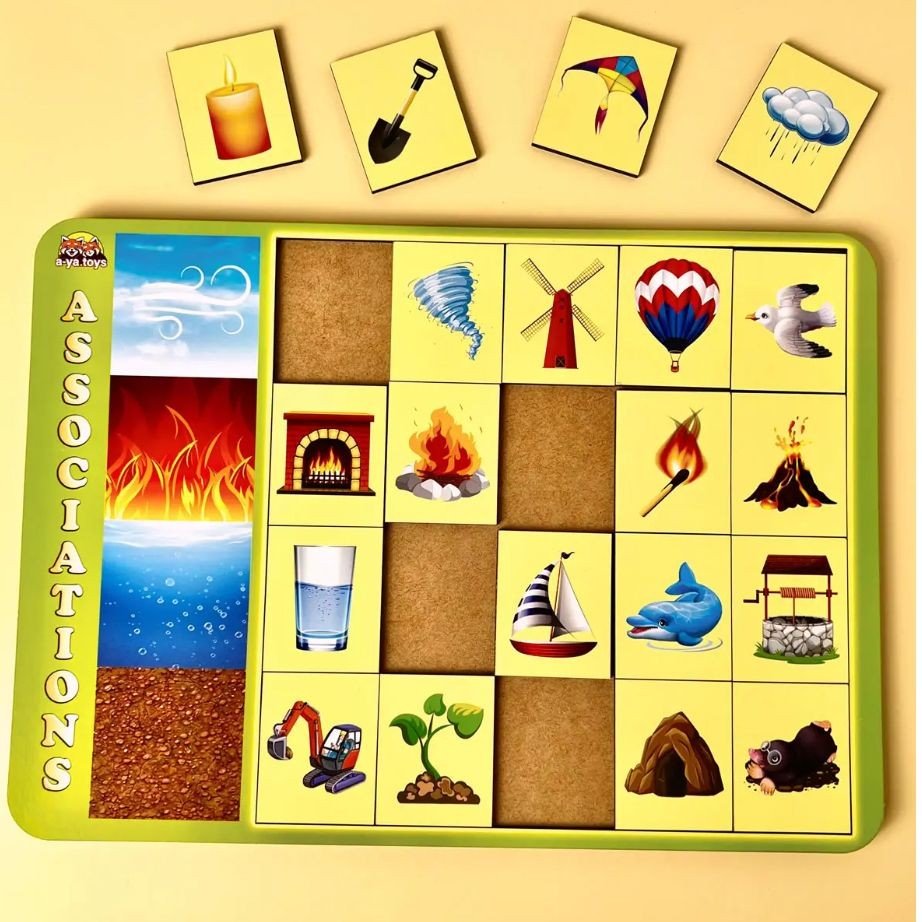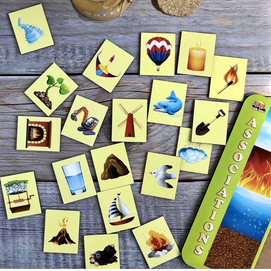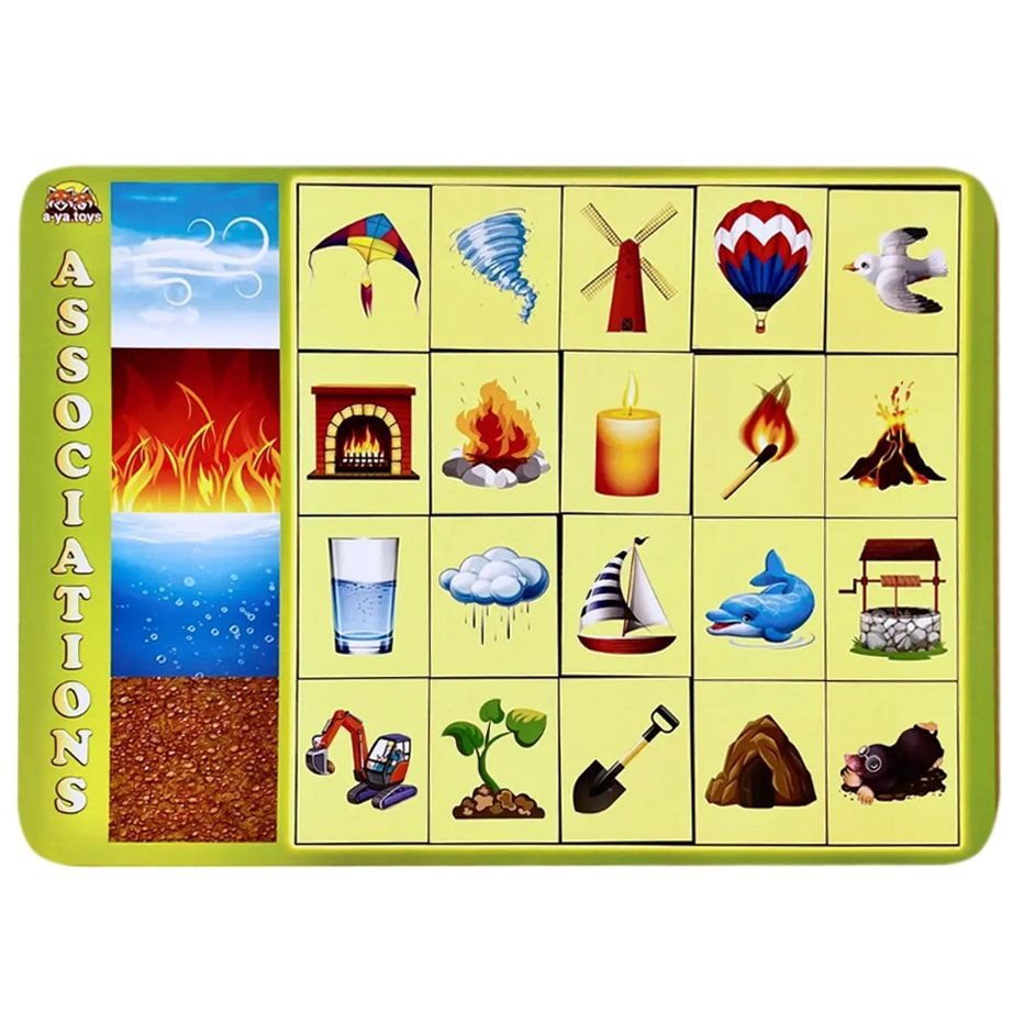 Гра складається з 20 плашок. Такий сортер допоможе пояснити дитині: які існують стихії у природі (вода, вогонь, повітря і земля), де ми зустрічаємо їх і до якої стихії належить той чи інший предмет: сірник - вогонь, хмара - вода, лопата - земля. Гра розвиває дрібну моторику рук, логічне мислення та уяву.
