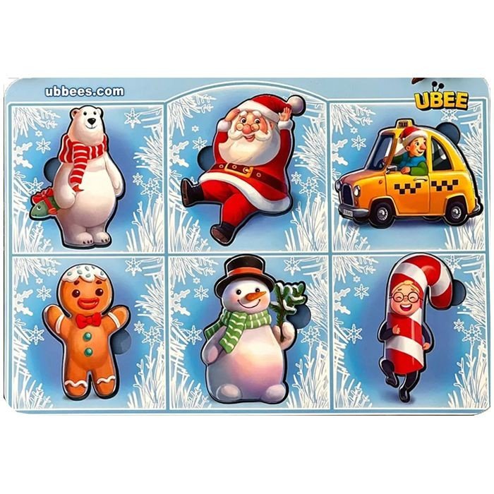Деревʼяний вкладиш у новорічній тематиці. Кожну фігурку потрібно поставити в призначену для неї комірку. На елементах вкладки зображені чарівні звірятка, які вже готові святкувати Новий рік. У наборі є 6 картинок. Допоможе розвивати дрібну моторику, логічне мислення, координацію рухів, увагу та памʼять. Виготовлений із якісних та безпечних матеріалів.