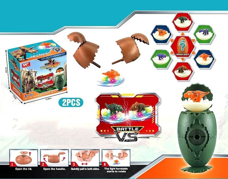Іграшка являє собою яйце динозавра, всередині якого - дзига з випадковою фігуркою. Потягніть з двох сторін - дзига "вилетить", почне крутитися і світитися. Можна влаштовувати битви двох Волчков. 2 яйця в наборі.