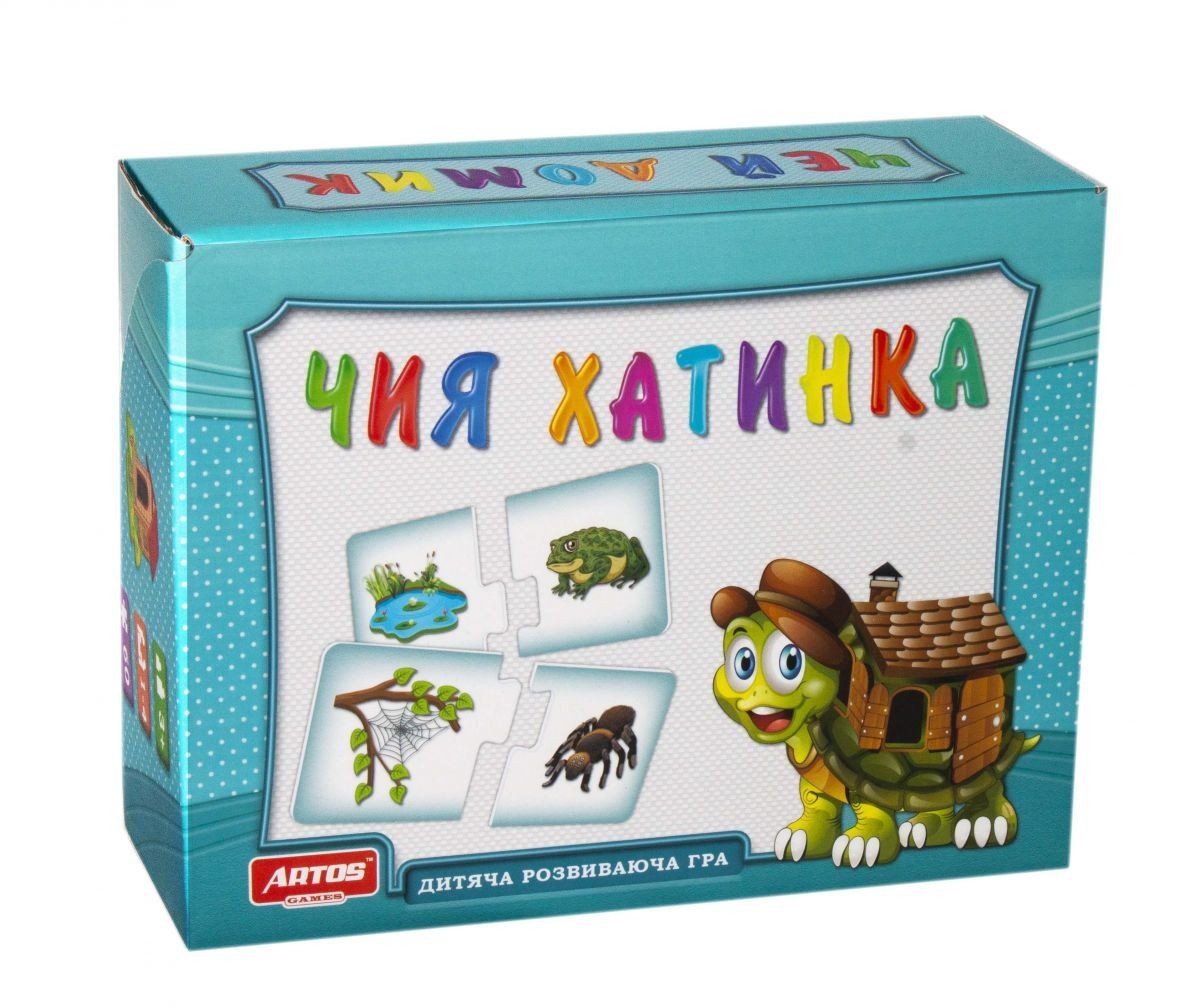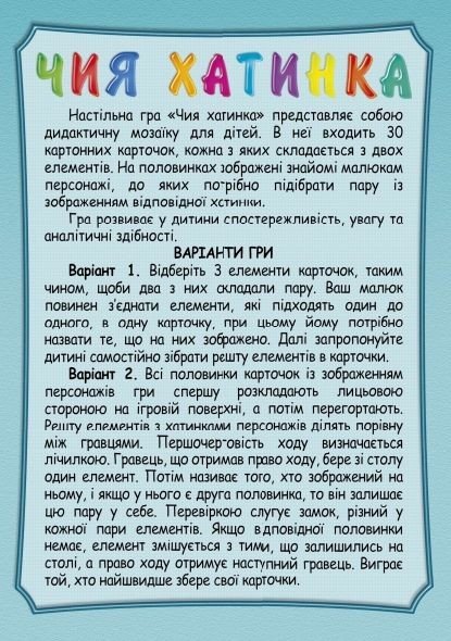 Дитяча розвиваюча гра "Чий будиночок". У настільну гру входить 30 картонних карток, кожна з яких складається з двох елементів. На половинах зображені знайомі дітям персонажі, до яких потрібно підібрати пару із зображенням відповідного будиночка.
