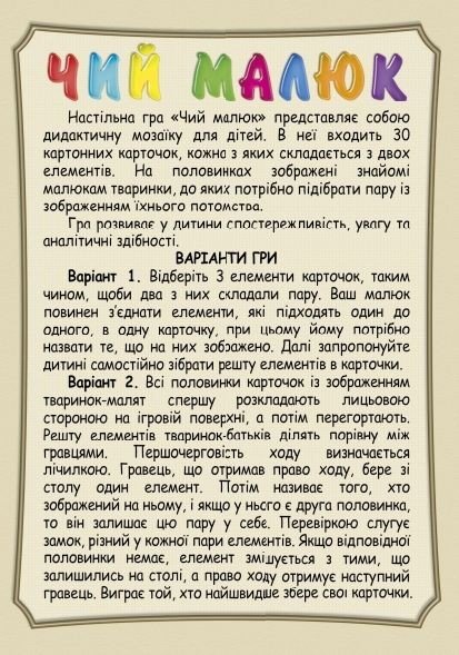 Дитяча розвиваюча гра "Чий малюк". У настільну гру входить 30 картонних карток, кожна з яких складається з двох елементів. На половинах зображені знайомі дітям тварини, до яких потрібно підібрати пару із зображенням їх потомства.