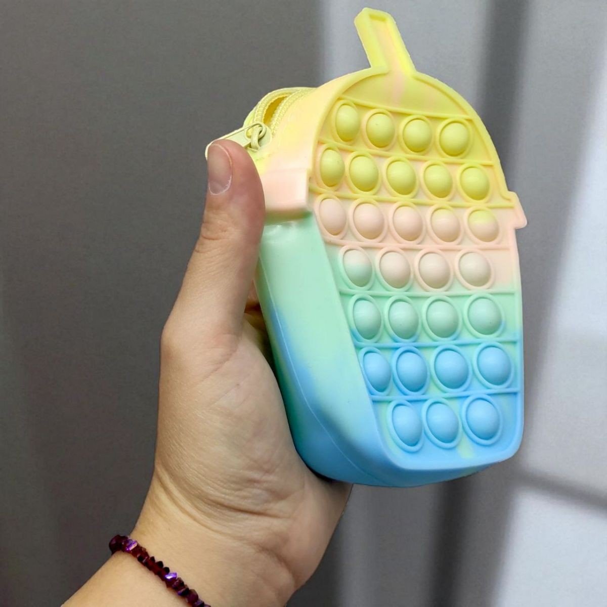 Сумочка антистрес у стилі бабл-ті. Маленька, але містка, у комплекті є яскравий ремінець, який можна регулювати по розміру. Має одне основне відділення, ідеальне для зберігання дрібниць або кишенькових речей. Сумка виготовлена з силікону та майже повністю у вигляді поп-іту. Рекомендовано для дітей віком від 3 років.