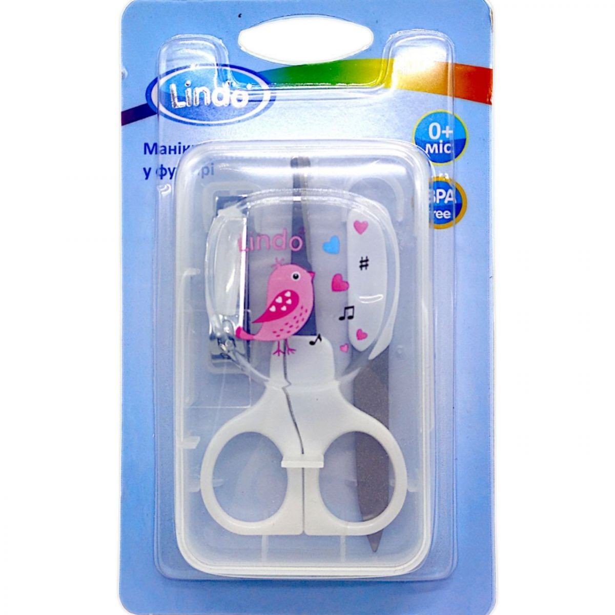 Дитячий манікюрний набір у футлярі. До складу входять усі необхідні інструменти для догляду за нігтями малюка: ножиці з заокругленими кінцями,пилочка та щипчики. Ножицями можна легко вкоротити та підправити форму нігтів, пилочка потрібна для шліфування та позбавлення від щербин та щипчики для відкушування відрослих нігтів. Виготовлено з пластика та нержавіючої сталі.