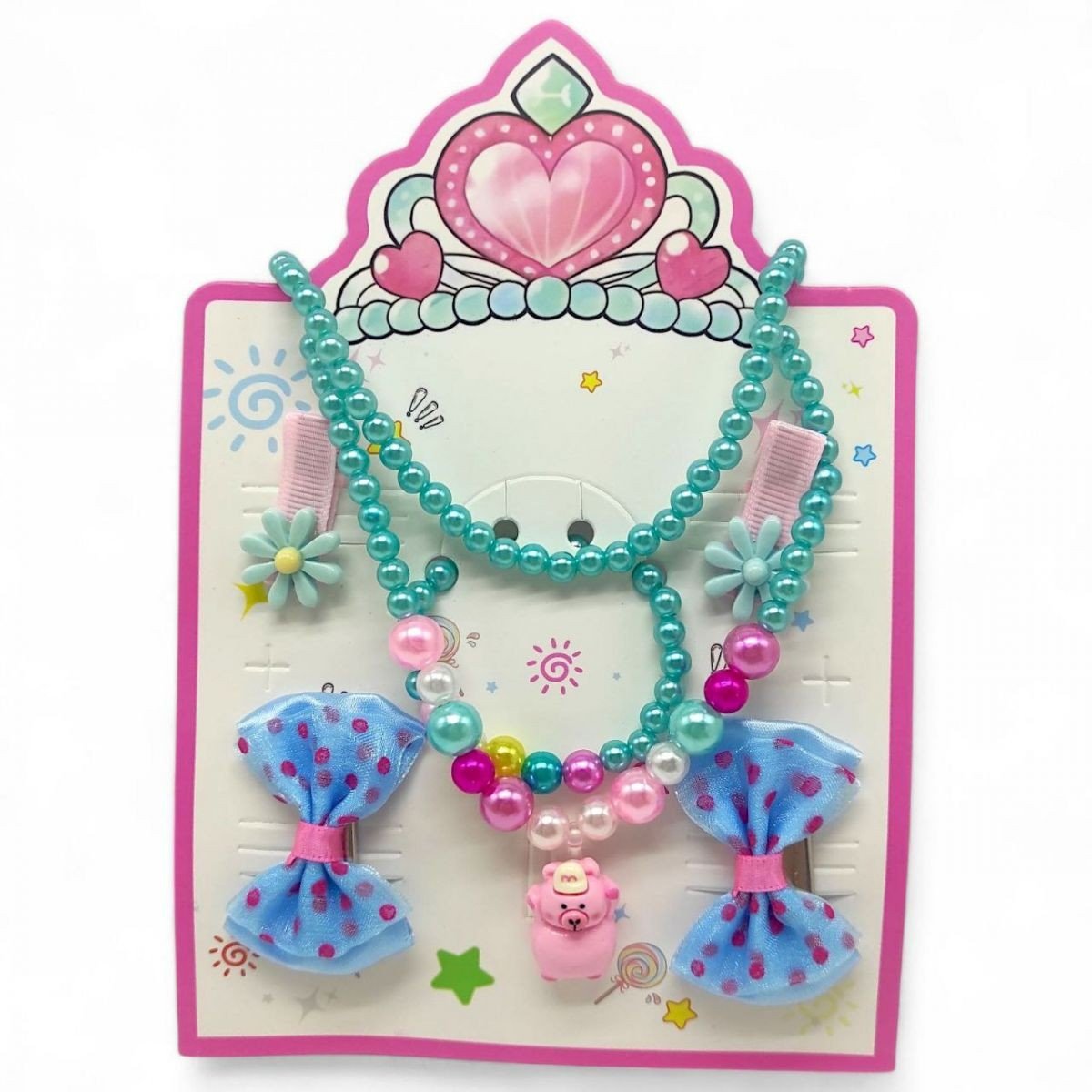 Цей набір прикрас ідеально підійде для будь-якої початківця модниці. У наборі є всі необхідні аксесуари, включаючи дві пари заколочок для волосся - одну у вигляді бантика, а іншу з квіткою - а також браслет і намисто. Намисто прикрашене мініатюрною фігуркою капібари. Довжина намиста - 20 см.
