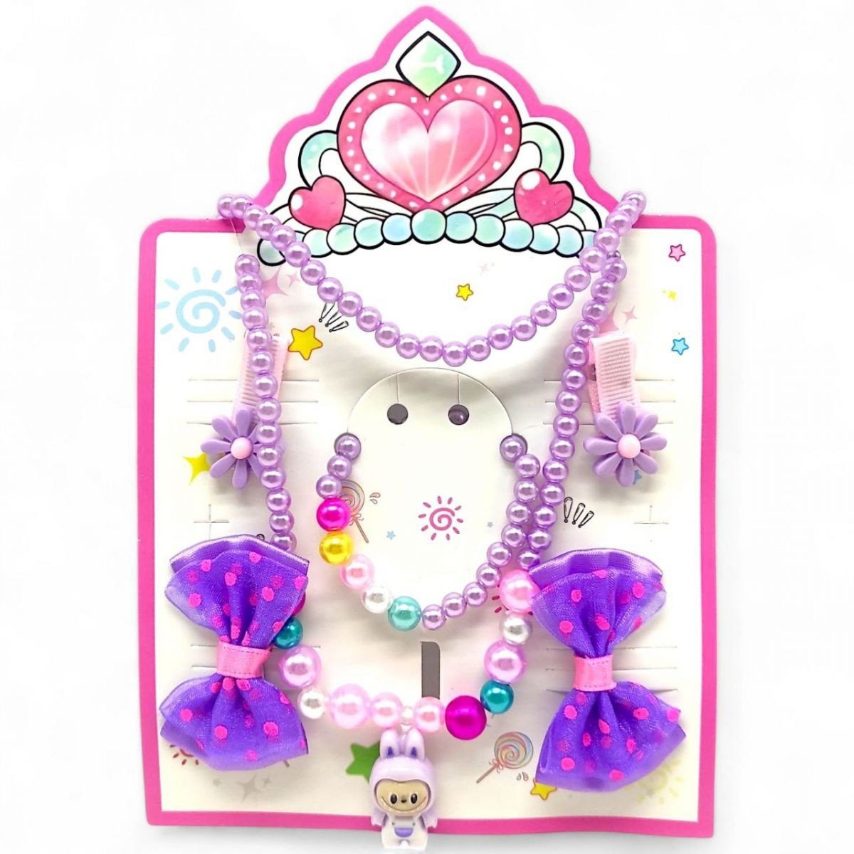 Цей набір прикрас ідеально підійде для будь-якої початківця модниці. У наборі є всі необхідні аксесуари, включаючи дві пари заколочок для волосся - одну у вигляді бантика, а іншу з квіткою - а також браслет і намисто. Намисто прикрашене мініатюрною фігуркою Лабубу. Довжина намиста - 20 см.