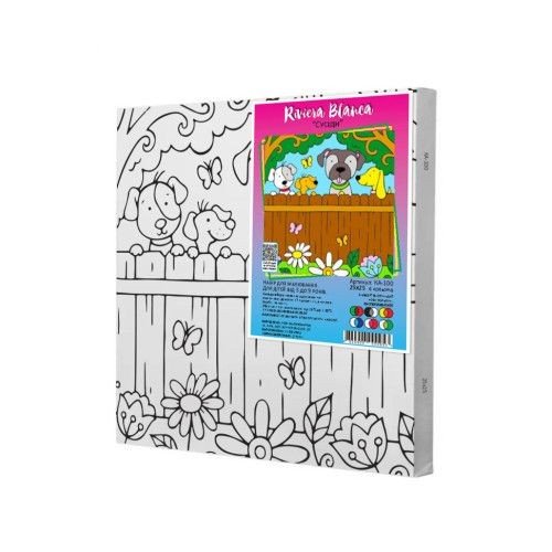 Комплектація: синтетичне полотно з нанесеними контурами майбутнього малюнка, натягнуте на дерев'яну рамку; водорозчинні акрилові фарби; пензлик