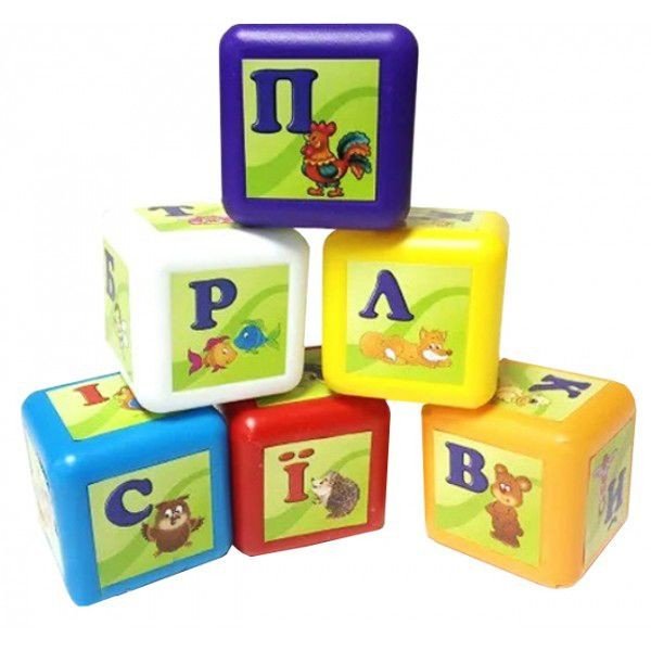 Кубики "Абетка" (9 штук). Розмір кубика - 6 х 6 х 6 см. На кожній із граней зображена одна літера українського алфавіту та барвиста картинка, значення якої починається з цієї літери, що допомагає швидше та краще запам'ятовувати літери.