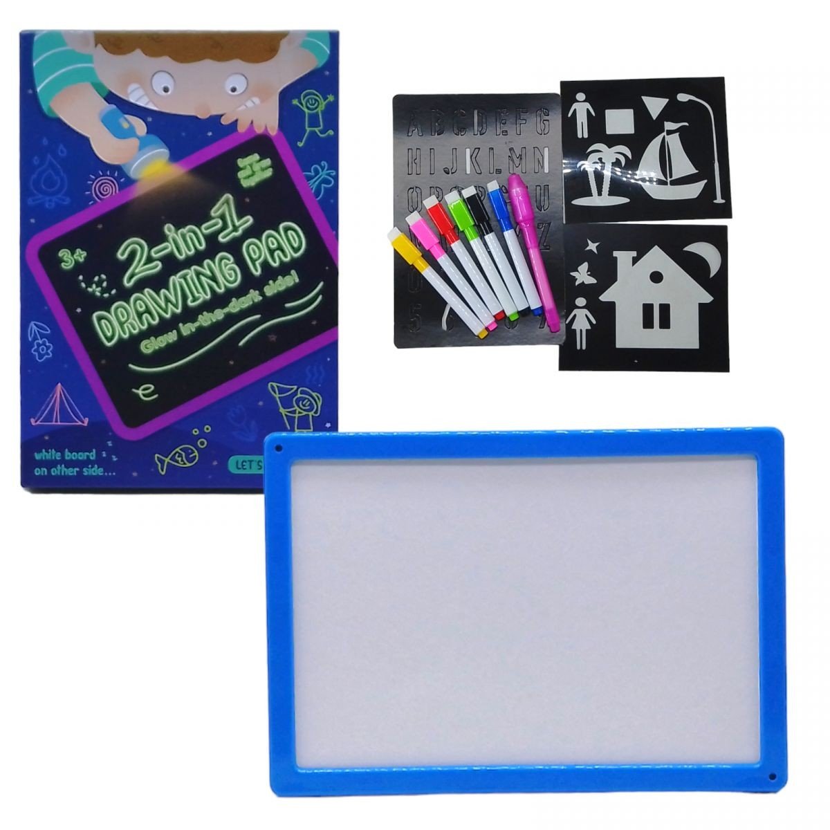 Двостороння дошка для звичайних маркерів та маркерів, які світяться у темряві. Може бути як цікавою забавкою для дітей у вільний час, так і освітньою іграшкою для дошкільнят. Вона дозволить малювати та писати все, що заманеться - тому можна як робити гарні малюнки, так і розв’язувати приклади. Її портативність та компактний розмір дозволяють брати її з собою куди завгодно, надаючи дитині простір для творчості. До дошки у комплект йдуть трафарети та маркери "пиши-стирай".