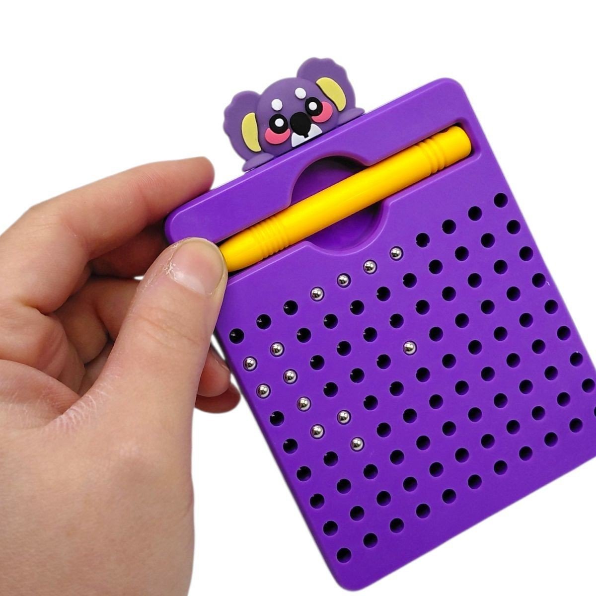 Магнітна дошка - компактна розвивальна іграшка зі стилусом та карабіном для кріплення. Дитина може створювати малюнки за допомогою магнітних кульок, розвиваючи моторику, уважність і фантазію. Зручний формат дозволяє брати дошку з собою в дорогу або на прогулянку.