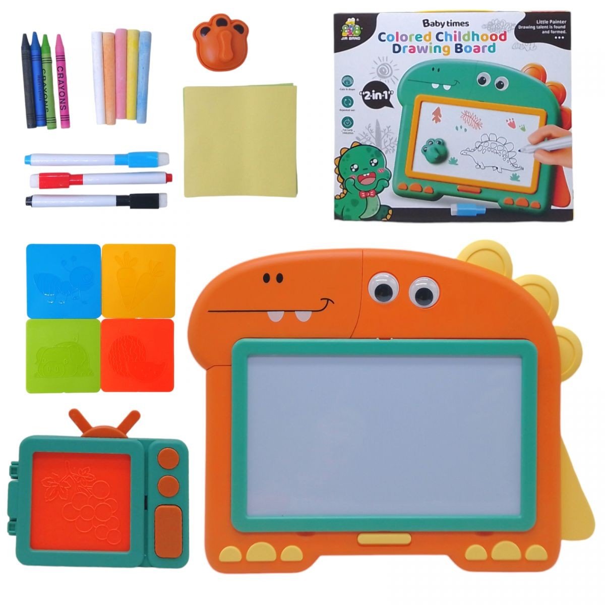 Бренд: Jia Bang Упаковка: Коробка Колір: Помаранчевий Вага з упаковкою: 695 г Габарити в упаковці: 28 x 32 x 6.5 см Країна виробник: Китай Матеріал: Комбінований Комплектація: Досточка, 4 ніжки, 4 трафарети та пристрій для них, 5 крейда, 4 воскові олівці, 3 фломастери, губка та набір листочків