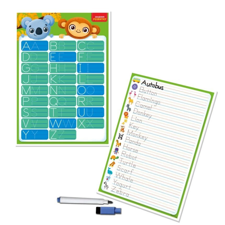 Розвиваюча дошка-тренажер для найменших. На одному боці дошки зображені літери англійського алфавіту, які дитина зможе обводити і писати маркером, що самостійно стирається. На звороті зображені різні тварини та предмети з їхніми назвами англійською мовою - дитина так само зможе обводити слова та навчиться писати їх самостійно.