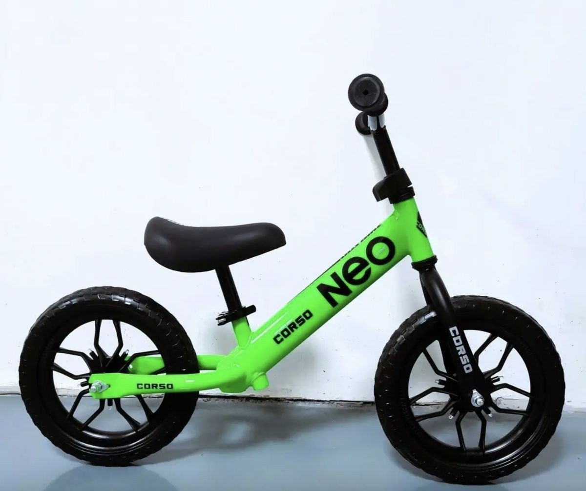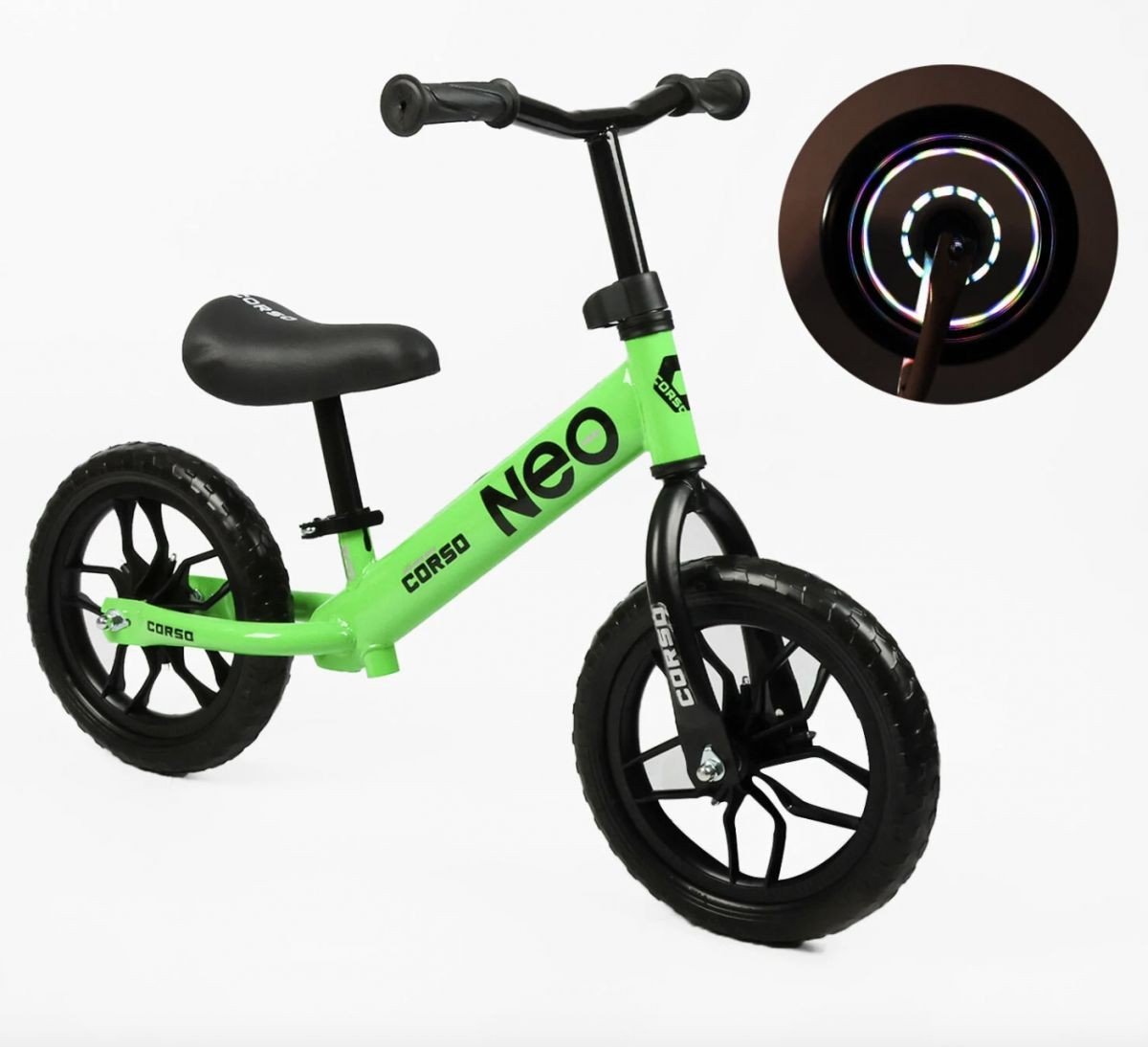 Опис Двоколісний дитячий біговел-велобіг, колеса ЕВА (піна) 12 дюймів, з підсвіткою, зелений