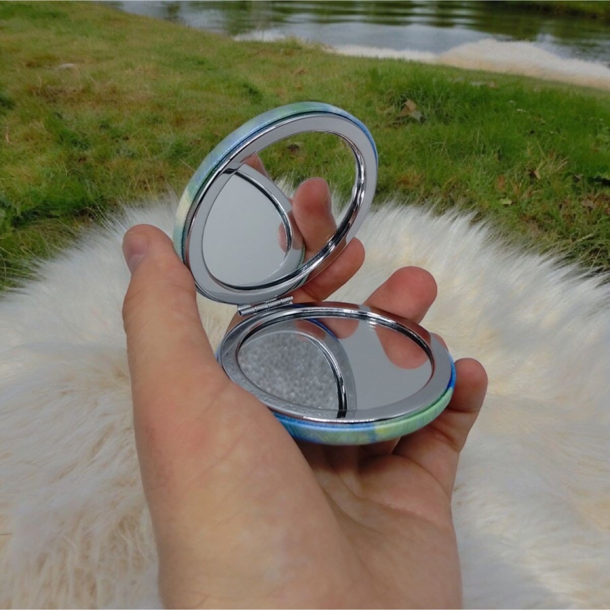 Стильне та зручне кругле косметичне дзеркало розділене на дві половинки, які притягуються одна до одної завдяки магнітному замиканню. Це дозволяє легко зберігати його в сумочці, не займаючи багато місця і завжди мати під рукою для швидкої перевірки макіяжу або укладання зачіски.