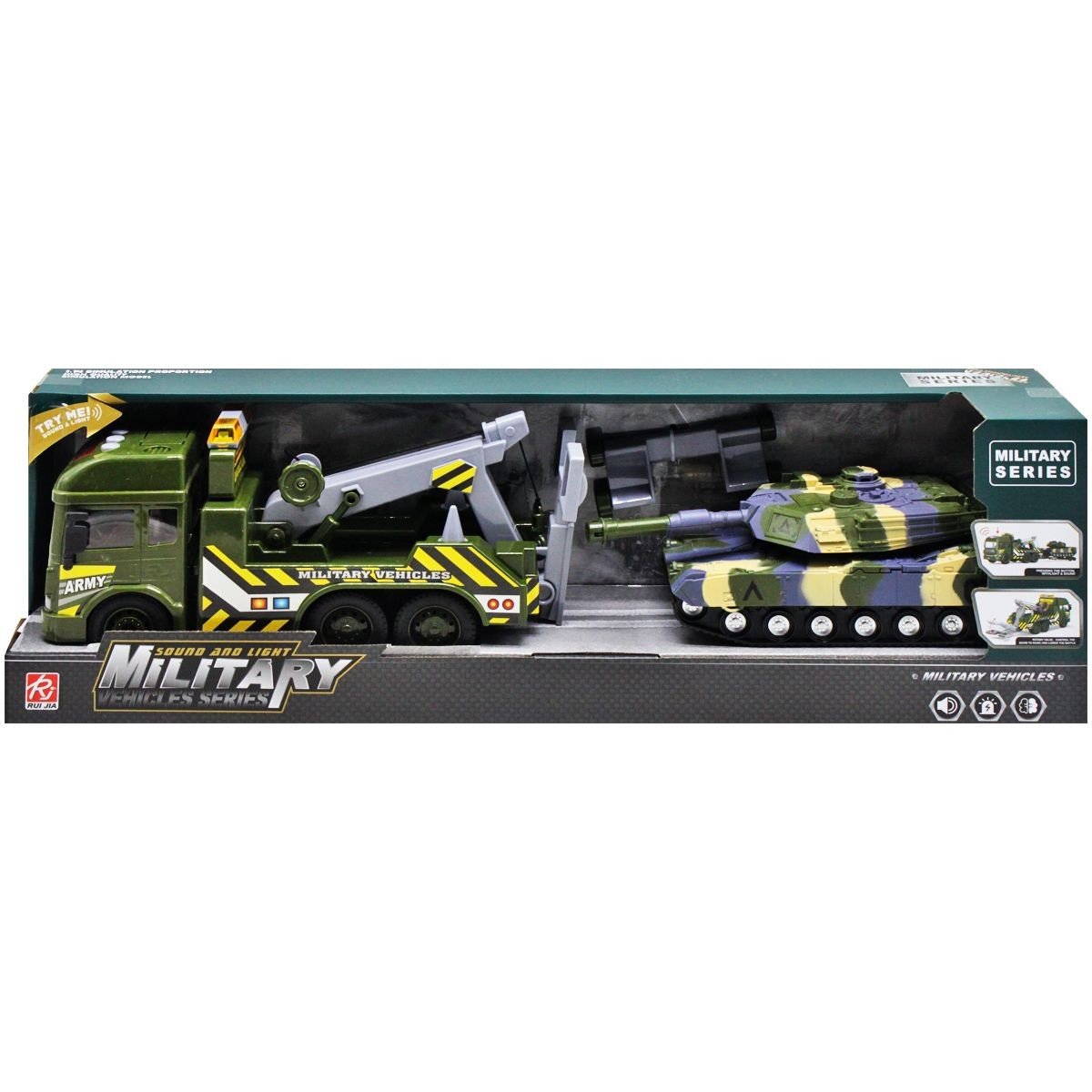 Військовий евакуатор з танком інерційний, інтерактивний. Виготовлено з якісного та безпечного матеріалу. Є світло та звук при натисканні на кнопки на даху. Працює на батарейках. Також наявні деякі рухливі деталі, наприклад, кран та причіп. Набір чудово підійде для ігор та сподобається дитині.