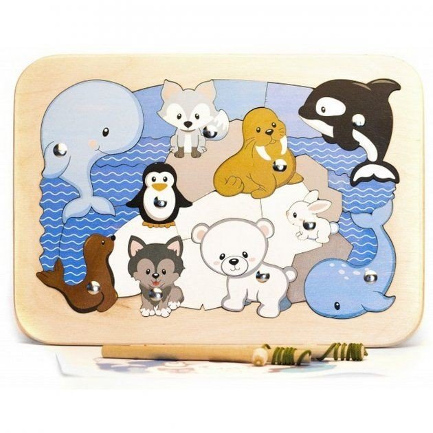 Дерев'яний еко-пазл "Арктика" буде чудовою іграшкою для маленьких любителів тварин. У комплекті є паличка з магнітною кулькою на мотузці, за допомогою якої можна витягувати елементи пазла. Іграшка виконана з якісних екологічних матеріалів, дерево гладке на дотик. Розмір пазла – 21х30 см.