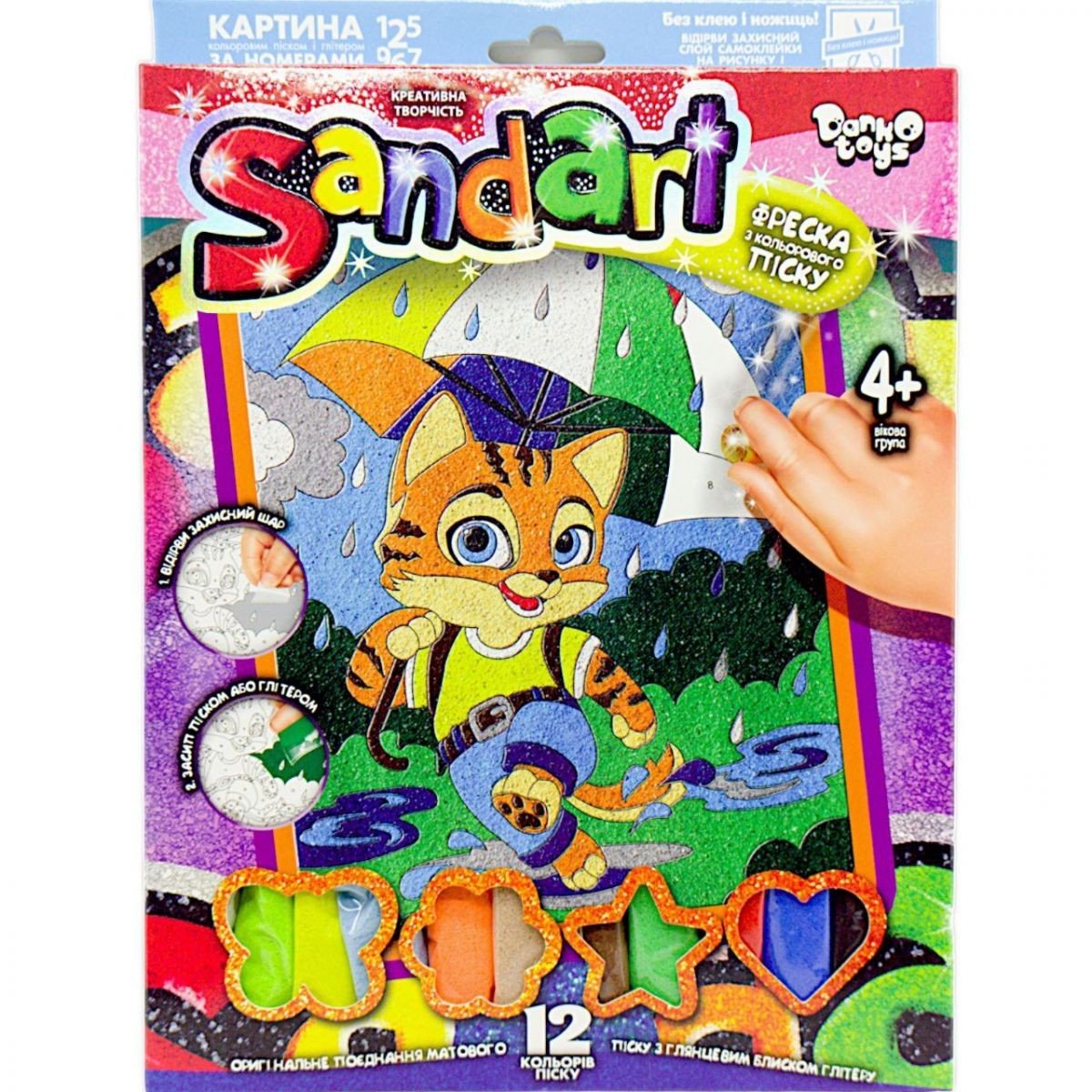 Бренд: Dankotoys Упаковка: Коробка Колір: Різнобарв'я Вага з упаковкою: 280 г Габарити в упаковці: 29.5 x 21.5 x 1.5 см Країна виробник: Україна Матеріал: Комбінований Комплектація: Картина-планшет, набір піску (12 кольорів), гліттерние блискітки, інструкція