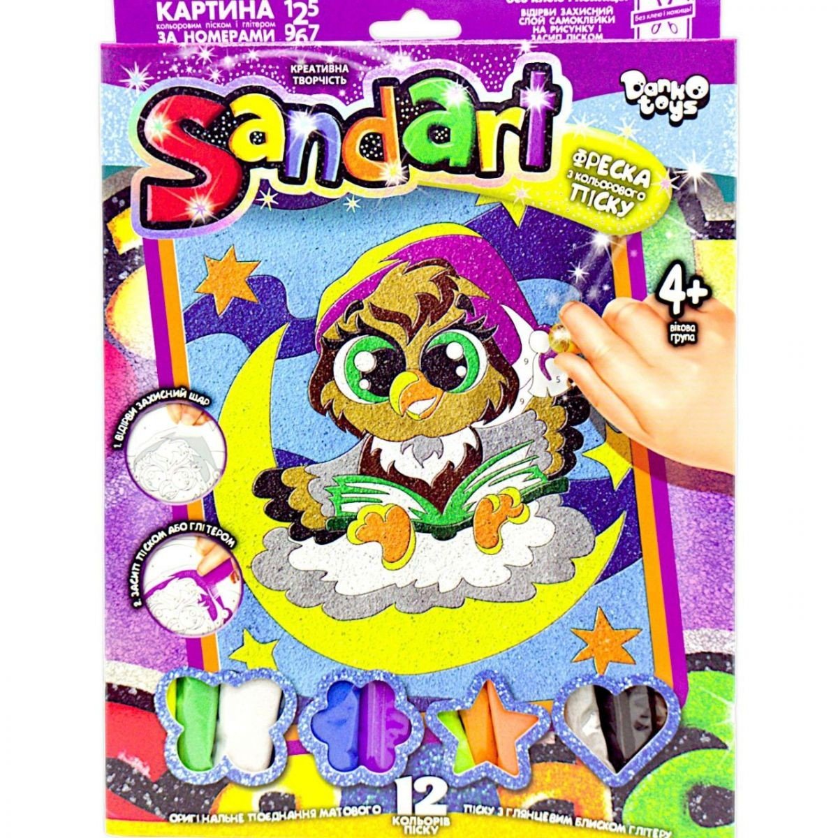 Набір для творчості "Sandart" фреска з кольорового піску. Розвиває креативне мислення, творчі здібності, художній смак. Без ножиць і клею. Інструкція: 1) Відокремте з ділянок, позначених одним певним номером, висічену захисну плівку; 2) Засипте на відкриту липку поверхню пісок обраного кольору. Ви можете прикрасити картину гліттерними блискітками, замінивши будь-який колір піску на гліттер, на свій розсуд. Підходить для діток старше 4 років.