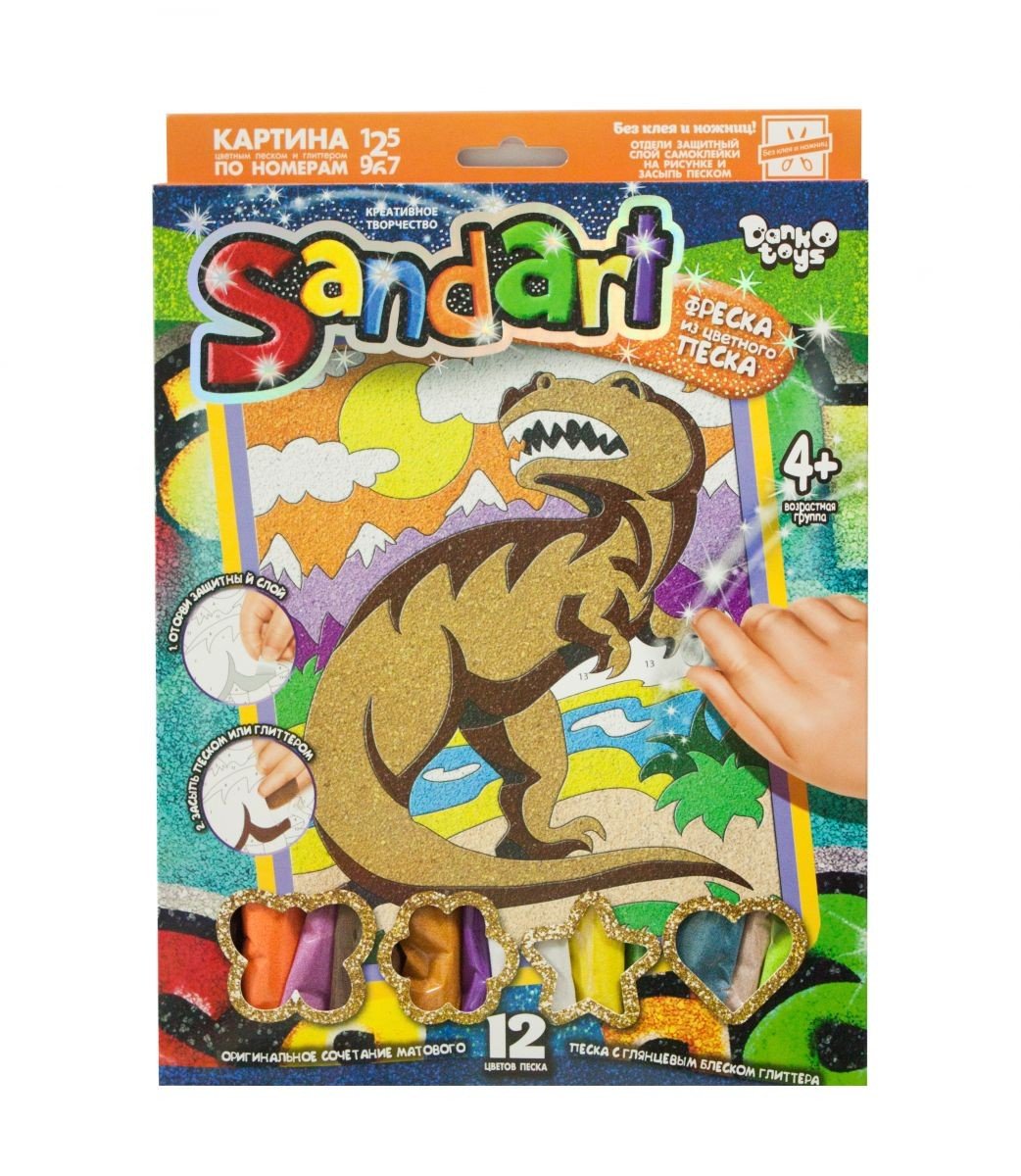 Набір для творчості "Sandart" фреска з кольорового піску. Розвиває креативне мислення, творчі здібності, художній смак. Без ножиць і клею. Інструкція: 1) Відокремте з ділянок, позначених одним певним номером, висічену захисну плівку; 2) Засипте на відкриту липку поверхню пісок обраного кольору. Ви можете прикрасити картину гліттернимі блискітками, замінивши будь-який колір піску на глиттер, на свій розсуд.