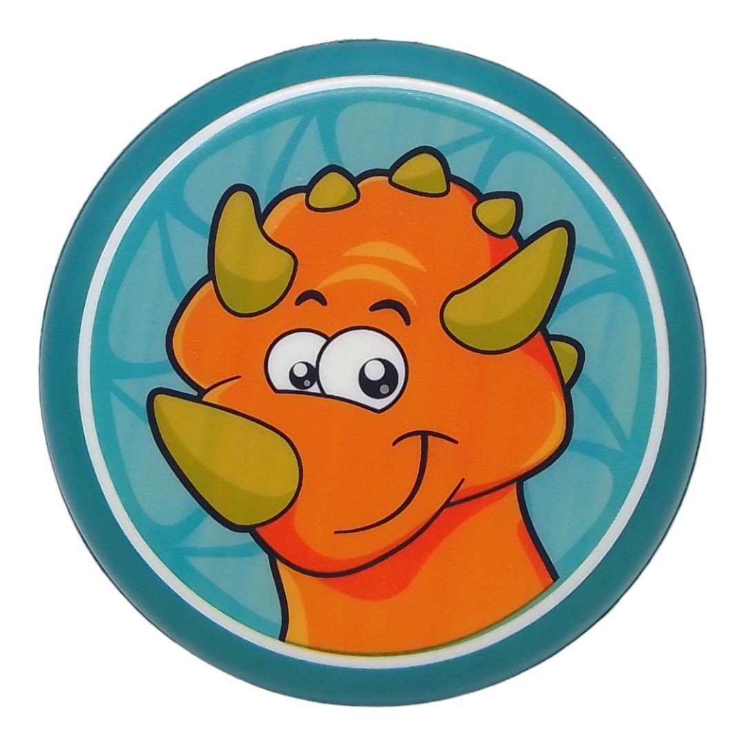 Яскрава тарілка фрісбі, виготовлена з легкого фомового матеріалу. Завдяки своїй невеликій вазі тарілка є повністю безпечною для використання дітьми, а також може далеко літати за вітром. Тарілка прикрашена зображенням милого динозаврика, який обовʼязково приверне увагу малюків. Діаметр – 16 см.