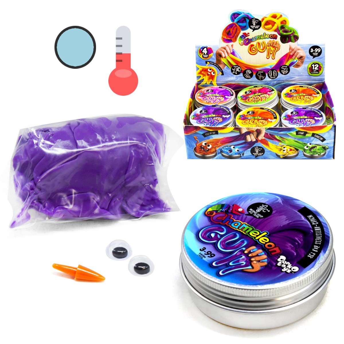 Бренд: Dankotoys Упаковка: Баночка Колір: Фіолетово-блакитний Тип ел-тів живлення: Немає Ел-ти живлення в комплекті: Ні Вага з упаковкою: 55 г Габарити в упаковці: 2.5 x 6.5 x 6.5 см Країна виробник: Україна Матеріал: Комбінований Комплектація: Жуйка, оченята