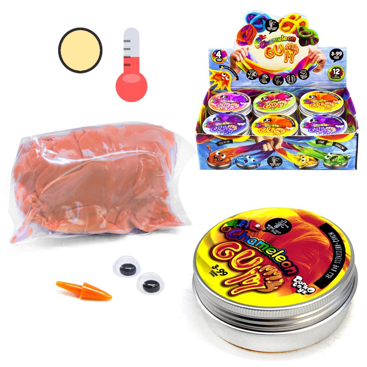 Бренд: Dankotoys Упаковка: Баночка Колір: Коралово-жовтий Тип ел-тів живлення: Немає Ел-ти живлення в комплекті: Ні Вага з упаковкою: 55 г Габарити в упаковці: 2.5 x 6.5 x 6.5 см Країна виробник: Україна Матеріал: Комбінований Комплектація: Жуйка, оченята