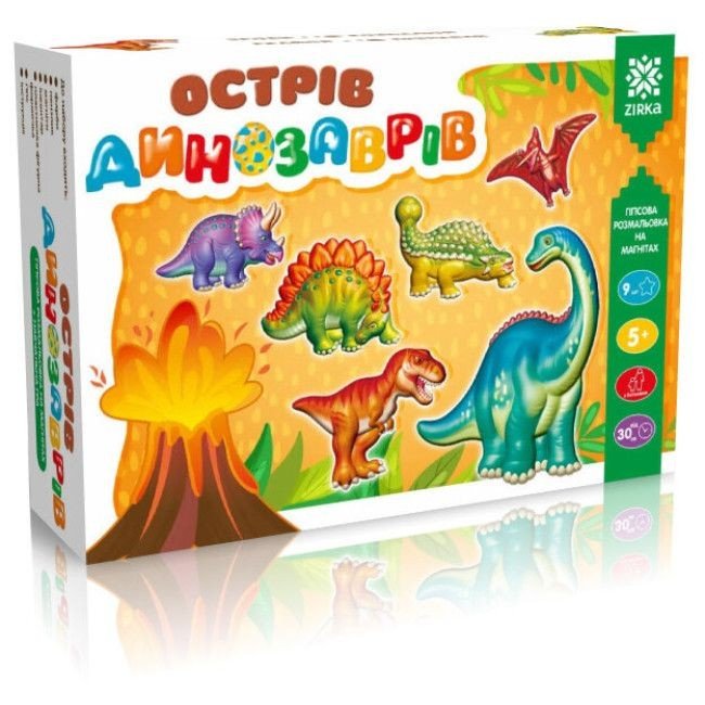 Бренд: ЗІРКА Упаковка: Коробка Колір: Різнобарв'я Вага з упаковкою: 310 г Габарити в упаковці: 22 x 6 x 15 см Габарити без упаковки: 22 x 6 x 15 см Країна виробник: Україна Матеріал: Комбінований Комплектація: Гіпс, магнітики (6 шт.), Формочка (6 динозаврів), фарби, пензлик, інструкція