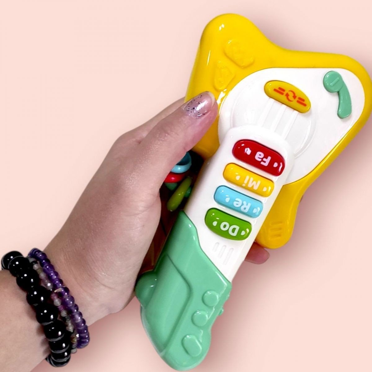 Інтерактивна гітара стане улюбленою розвагою для вашого малюка! Натискаючи на кнопки, дитина почує мелодійні звуки та приємну музику, які супроводжуються яскравим підсвічуванням. Збоку іграшки розташовані кільця-брязкальця, які додатково розважать малюка і допоможуть у розвитку дрібної моторики. Компактний розмір ідеально підходить для маленьких ручок!