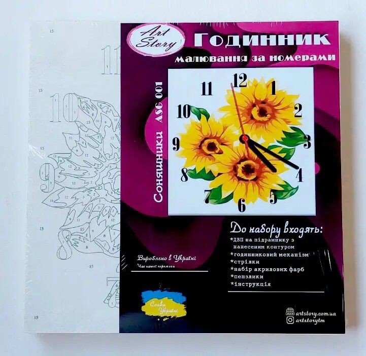 За допомогою даного набору можна розфарбовувати не просто картину, а справжній годинник. Подібний виріб стане чудовим подарунком або доповненням інтерʼєру. Для того, щоб намалювати картину, необхідно малювати за пронумерованими контурами, які відповідають кольору фарби. У наборі: годинниковий механізм зі стрілками, ДВП на широкому підрамнику (2,5 см.), паперова дублікат з контурним малюнком картини (на картині нанесена схема контурів зображення з нумерацією), нейлонові художні пензлі, палітра акрилових фарб у контейнерах та зручне кріплення. Усі необхідні фарби вже в комплекті та не потребують змішування. Розмір: 30х30 см.