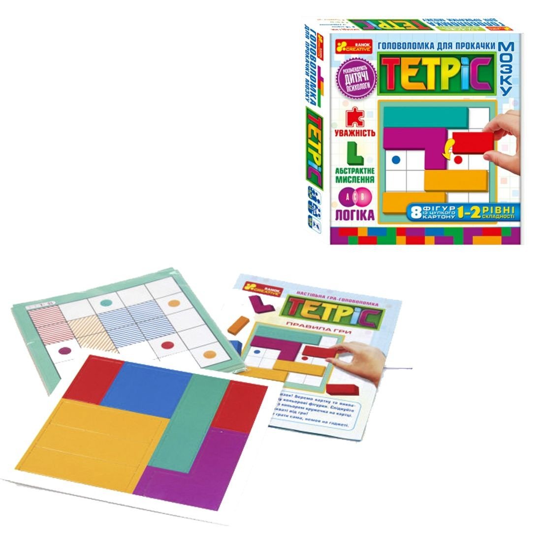 Настільна гра для прокачування мозку "Тетріс". Відмінно розвиває уважність, логіку і абстрактне мислення. Гра має 2 рівня. У комплекті є 8 фігур з міцного картону, 15 карток із завданнями, правила гри.