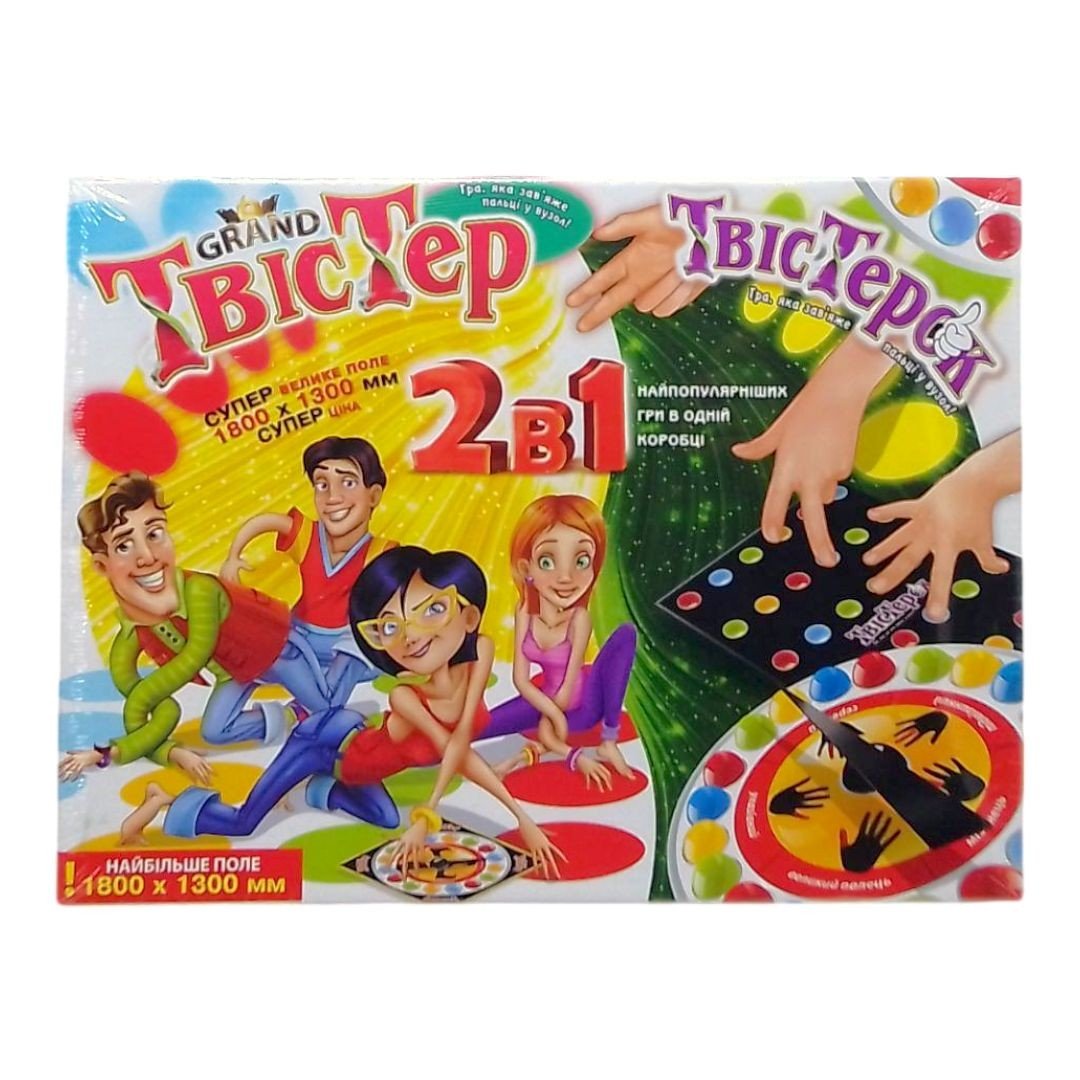 Настільна, гра+гра на підлогу 2 в 1 "Твістер гранд + Твістерок". Правила гри: гравець крутить рулетку, яка показує яку руку або ногу поставити на гурток певного кольору. Не можна торкатися "поля" колінами і ліктями. Друга гра - все те ж саме, але в грі задіяні тільки пальці.