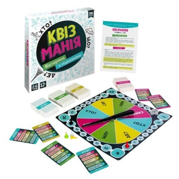 Перед вами веселий квіз для вечірки - вікторина іх питаннями з різноманітних сфер, а відповіді вам допоможуть знайти підказки! Ігрова рулетка та відсутність черговості відповідей роблять гру азартною та мегавеселою. У грі 2 режима, ви можете обрати той, який краще підходить вашій компанії. Українською мовою. Для 2-6 гравців. Вік: 12+.