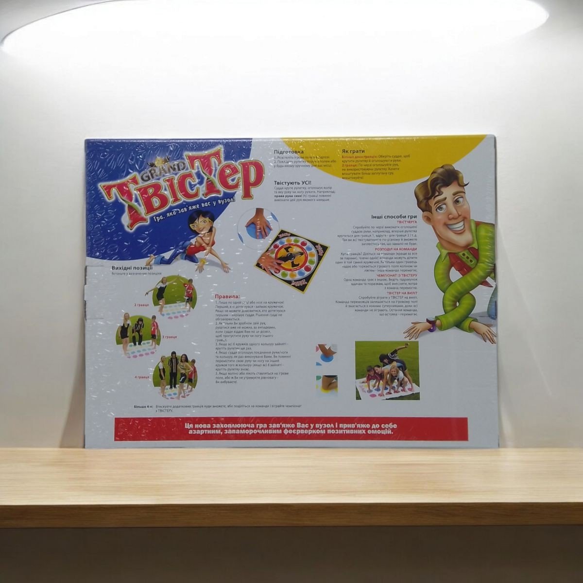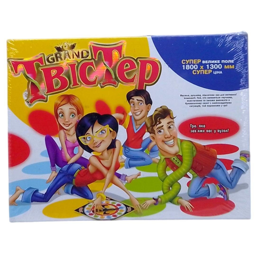 Гра "Твістер гранд". Правила гри: гравець крутить рулетку, яка показує що поставити (яку руку або ногу) на коло певного кольору. Не можна торкатися "поля" колінами і ліктями. Комплектація: велике ігрове поле (1800х1300 мм), рулетка, кнопка, стрілка.