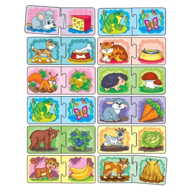 Розвиваюча гра для малюків дошкільного віку допоможе дитині вивчити деяких тварин і дізнатися, чим вони харчуються. Гра розвине логічне мислення, памʼять, увагу, словниковий запас і дрібну моторику рук. Є кілька варіантів гри.