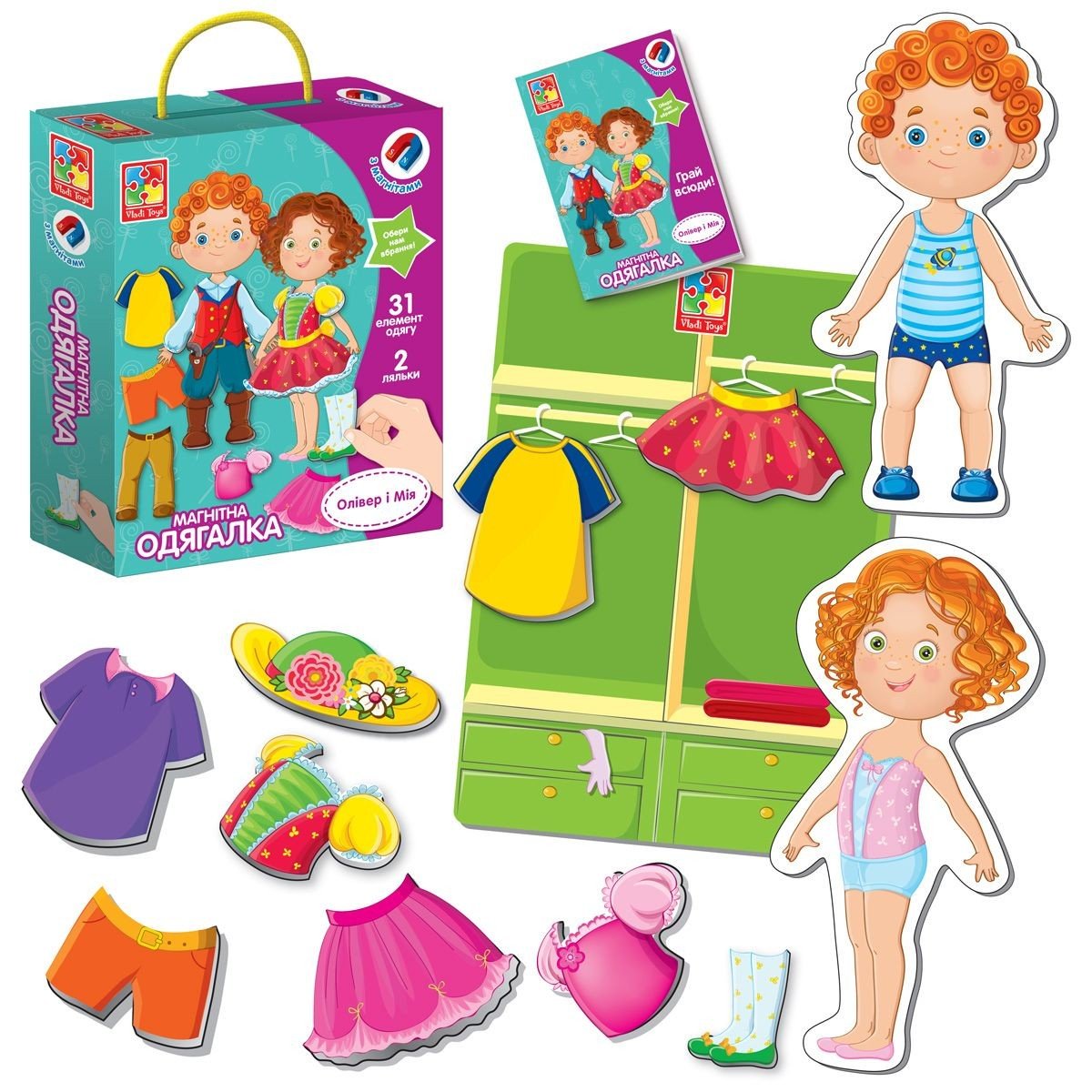 Олівер і Мія головні герої магнітної одягалки. Підбирайте образи по підказкам з модного журналу або створюйте свої модні комбінації. Розгляньте магнітні елементи одягу. Доберіть дівчинці та хлопчику вбрання. Поєднуйте різні магніти разом та створюйте свої неповторні образи. Гра розвиває уяву, креативне мислення, творчі навички та дрібну моторику. Набір містить: 2 ляльки, 31 магнітний елемент одягу, шафа для одягу, модний журнал. Підходить для діток 3-6 років.