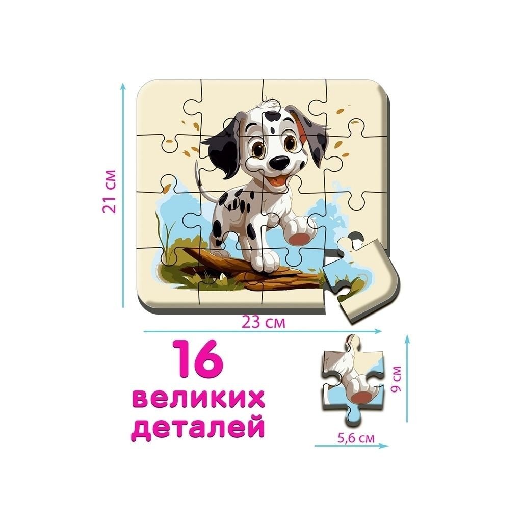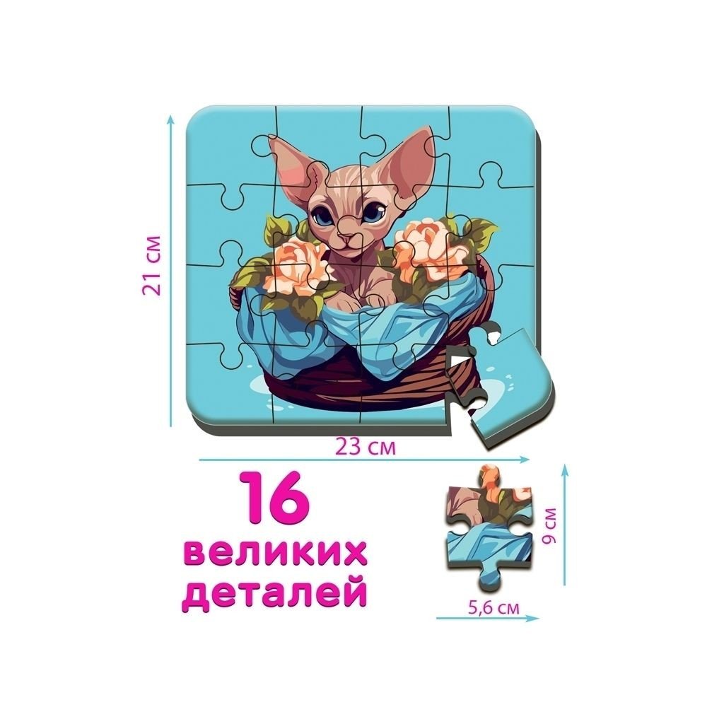 Пазл складається з 16 великих елементів із міцного картону, що робить його ідеальним вибором для маленьких дитячих ручок. Після складання вийде яскрава і барвиста картинка розміром 23 х 21 см. Сприяє розвитку моторики, логічного мислення та уяви малюка.