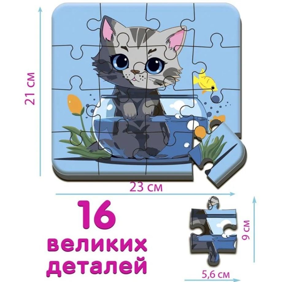 Пазл складається з 16 великих елементів із міцного картону, що робить його ідеальним вибором для маленьких дитячих ручок. Після складання вийде яскрава і барвиста картинка розміром 23 х 21 см. Сприяє розвитку моторики, логічного мислення та уяви малюка.