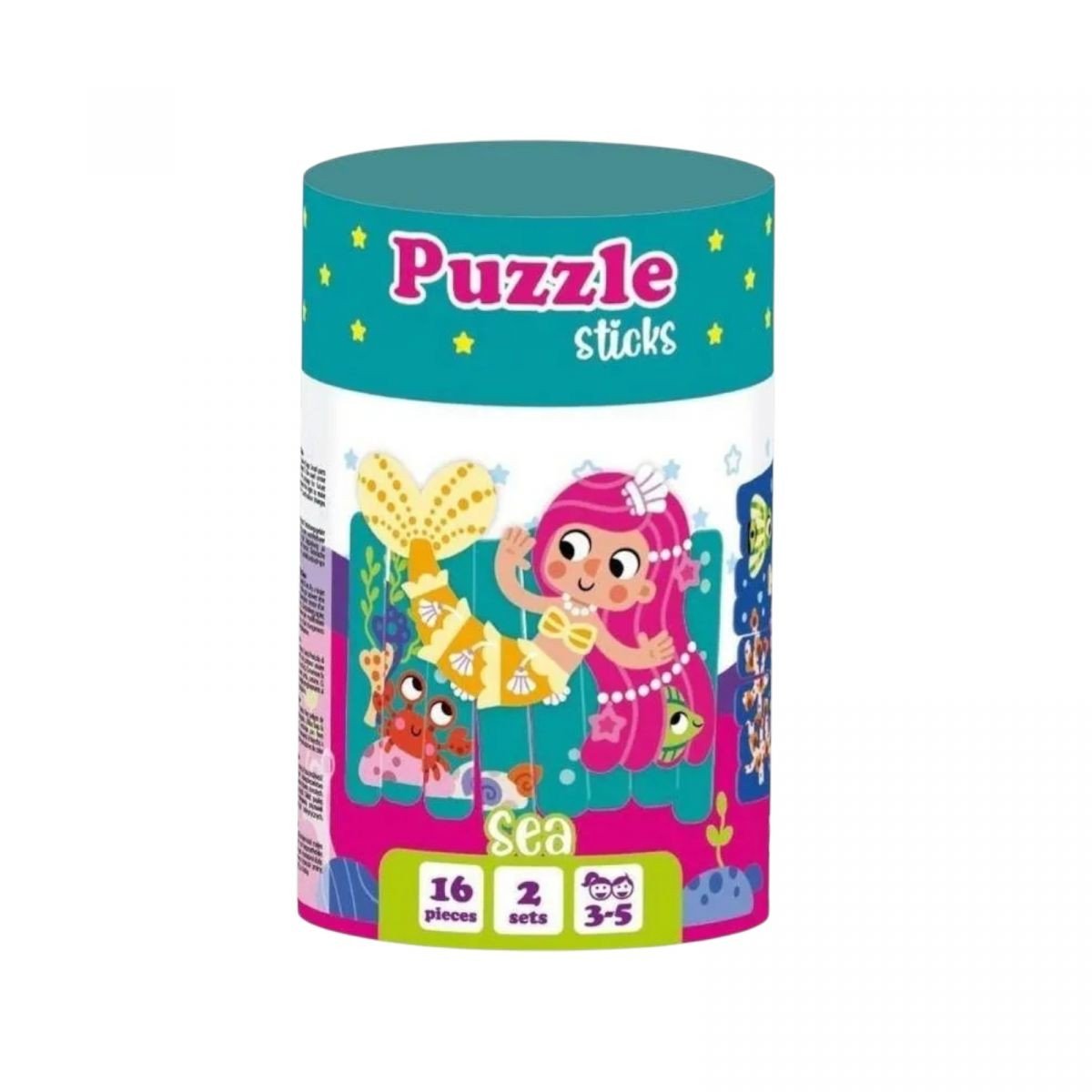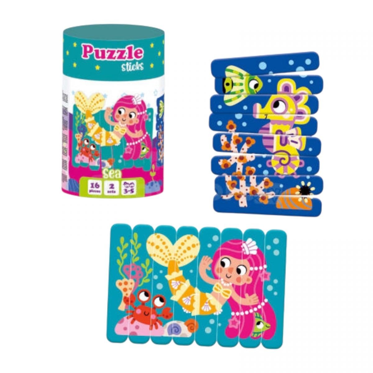 Пазли в тубусі для малюків. Збирайте відразу дві пазлові картинки та знайомтеся з підводним світом. Спеціально для маленьких ручок великі палички, які зручно тримати й обʼєднувати між собою. 16 паличок потрібно розкласти зображенням догори, розділити їх на 2 групи по кольорах і по черзі скласти картинки. Грайте і тренуйте дрібну моторику, уважність і логічне мислення. Комплектація включає пазлові палички 16 елементів. Рекомендовано для дітей віком від 3–5 років.