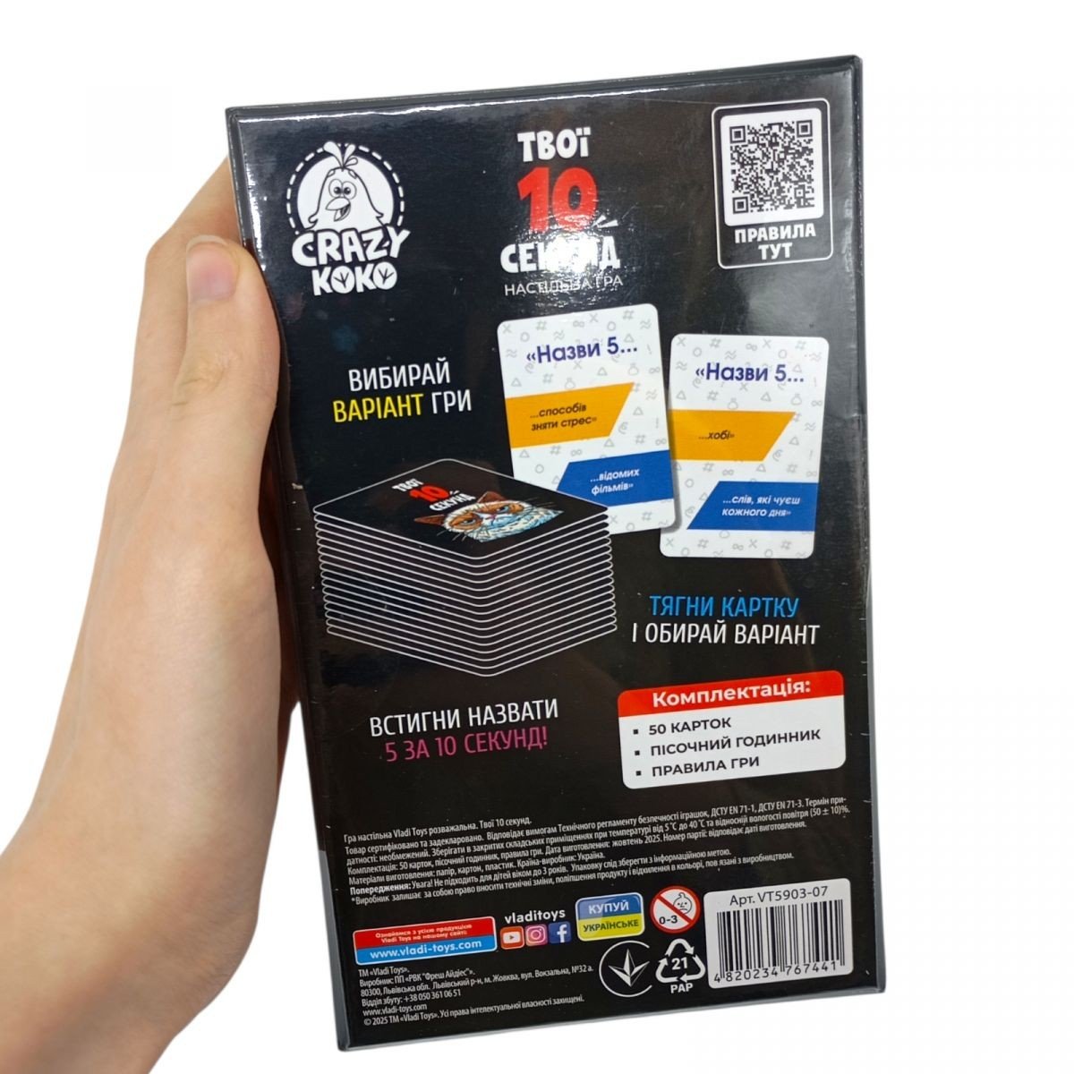Настільна гра "Твої 10 секунд" - спробуй назвати 5 речей за обмежений час! Тягни картку та обирай один з двох варіантів запитання, завдяки таймеру гра може створити безліч неочікуваних та веселих відповідей. Ідеально підходить для гри з друзями та сімʼєю. В комплекті присутньо 50 карток, пісочний годинник та інструкція з правилами гри.