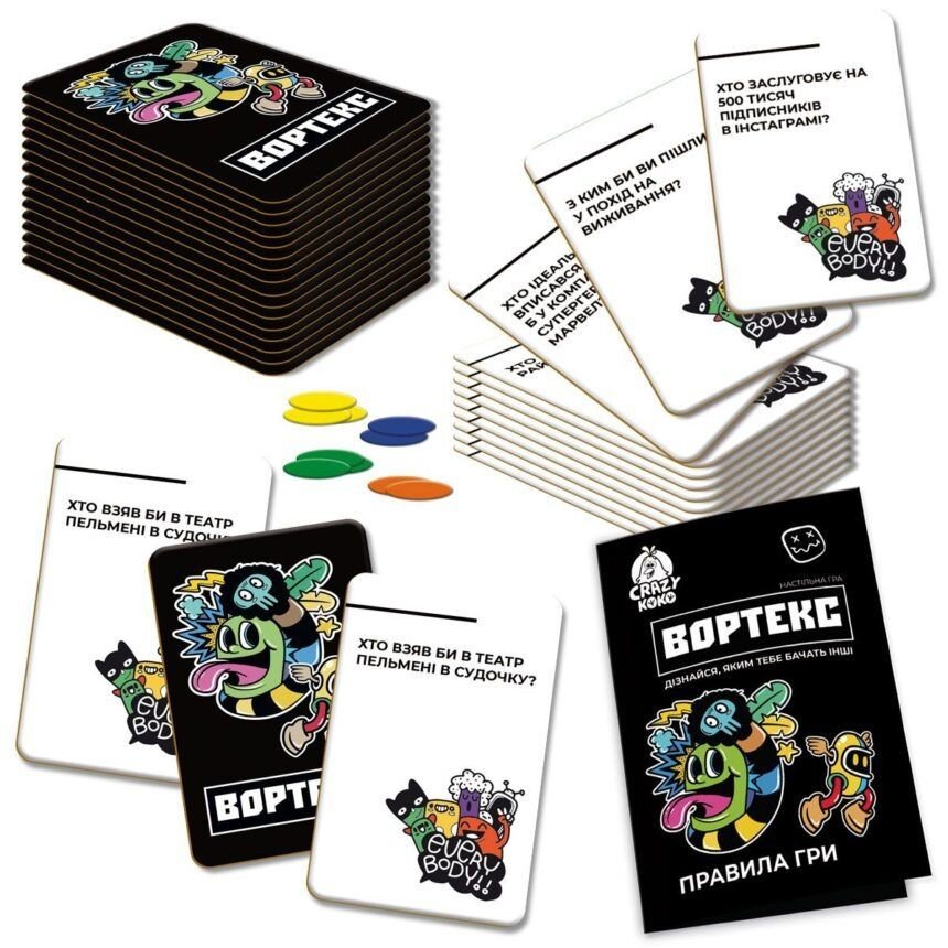 Плануєте веселий вечір із друзями, чи просто хочете добре провести час у колі родини — настільна гра “Вортекс” стане ідеальним вибором! Ця гра подарує вам щирий сміх, легку атмосферу й безліч несподіваних моментів завдяки дотепним запитанням та голосуванням. Обирайте, кому віддати жетон, дізнавайтесь нові цікаві факти одне про одного і насолоджуйтесь живим спілкуванням. “Вортекс” — це гарантована доза гарного настрою та позитивних емоцій для кожного учасника!