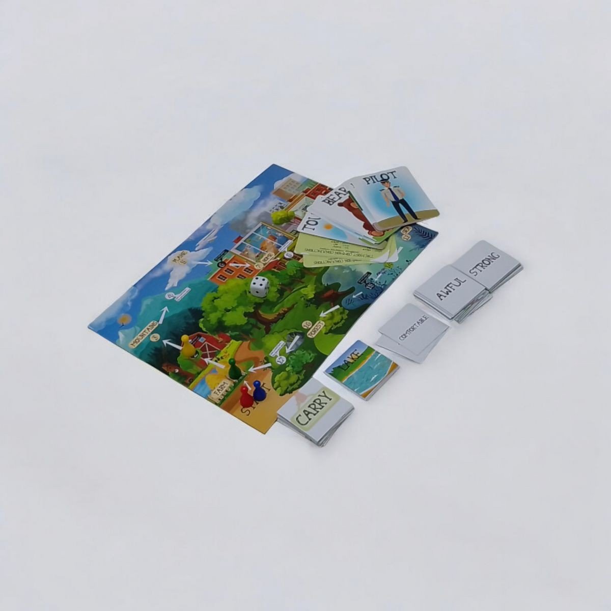 Бренд: Умняшка Упаковка: Коробка Колір: Різнобарв'я Вага з упаковкою: 340 г Габарити в упаковці: 16 x 24 x 5 см Країна виробник: Україна Матеріал: Картон Комплектація: 12 карток з персонажами, 32 картки з прикменниками, 32 картки з іменниками, 42 картки з дієсловами, ігрове поле (22 х 31 см), 4 фішки, кубик