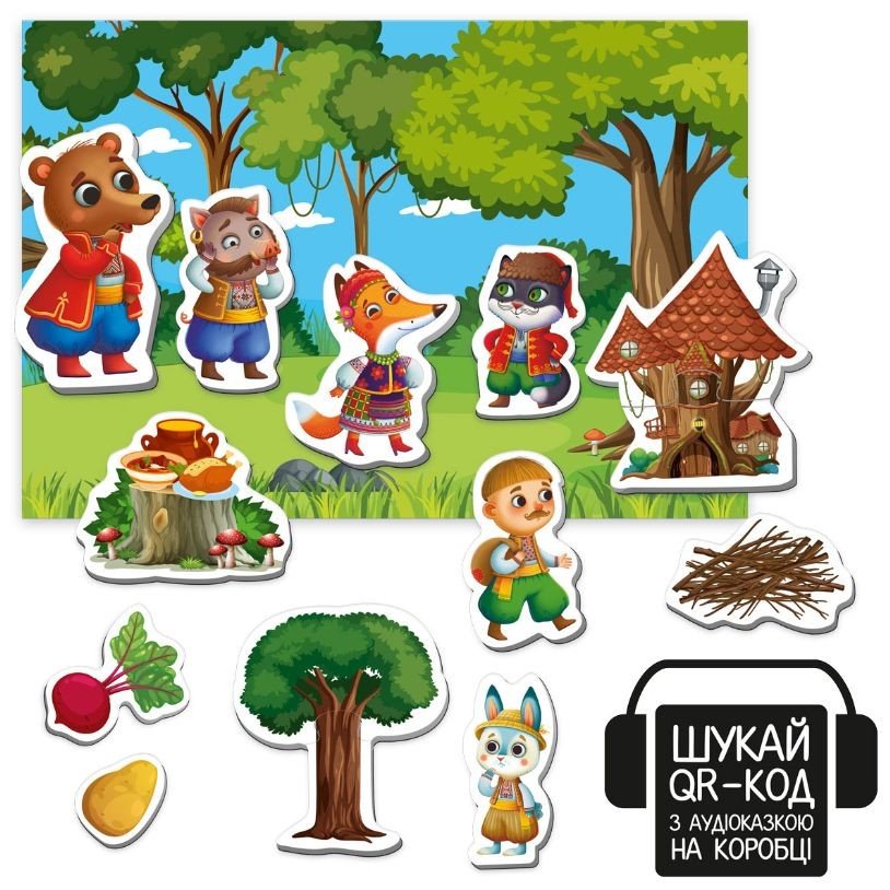Гра + казка = Гра настільна Vladi Toys магнітний театр з аудіоказкою Казкові голоси. Найперші казочки для малюка з можливістю пограти і влаштувати спектакль за допомогою магнітних персонажів під прослуховування казки, і просто включити послухати казочку, коли батьки зайняті. Персонажі чудово розміщуються на магнітній поверхні, в якості якої може виступити, наприклад, магнітна дошка чи холодильник. Шукай аудіоказку за QR-кодом на коробці, скануй, переходь за посиланням та слухай.