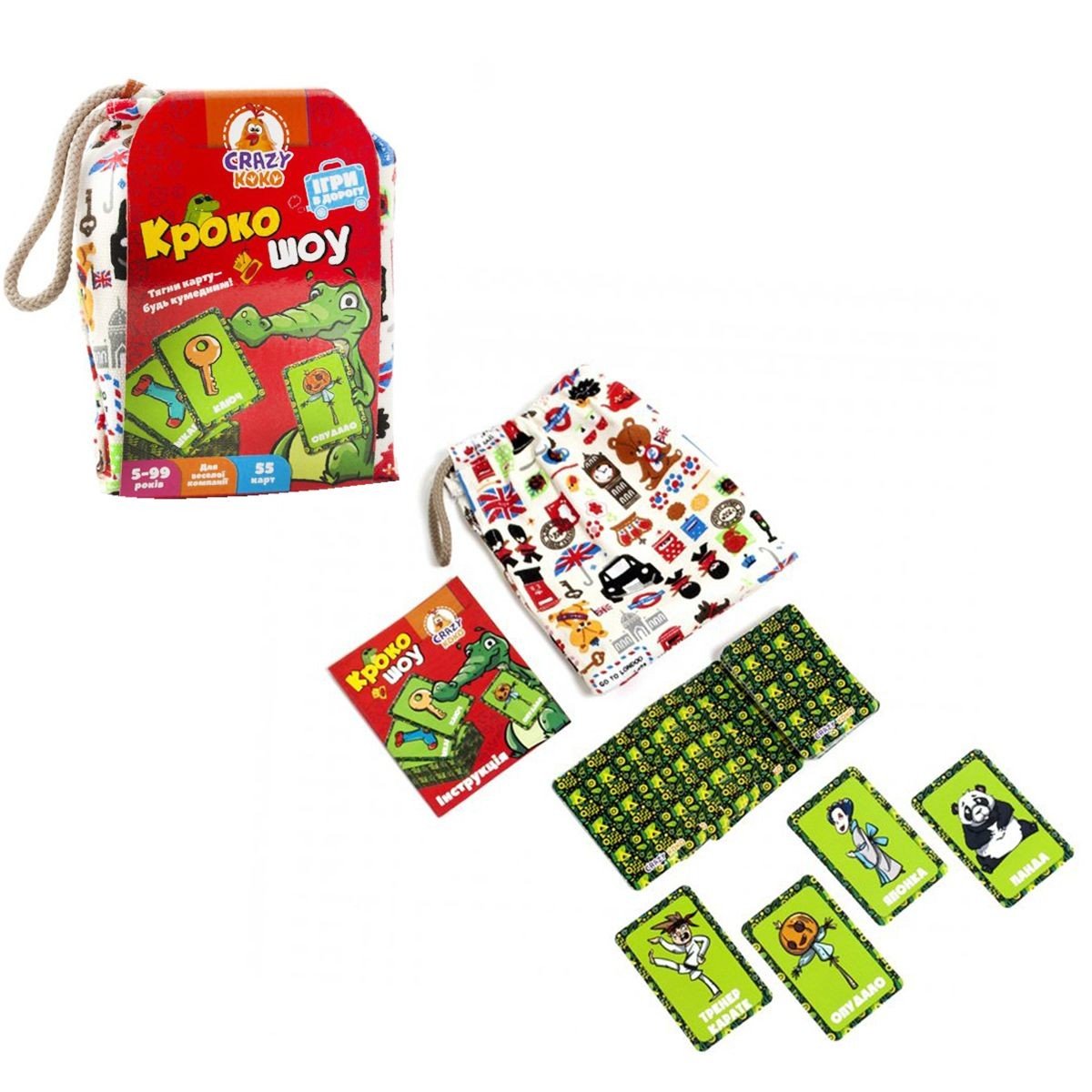 Захоплююча гра за типом гри "Крокодил" призначена для гравців від 5-ти років. Гравцям потрібно без слів пояснити, який предмет або тварина зображені на картці. Можна використовувати тільки жести і міміку. Мета гри - вгадати, до то ким прикидається і зібрати більше всіх карт. У комплекті: тканинний мішечок, 55 карток та інструкція. Розмір картки: 9 х 6 см. Колір і дизайн мішечка попадається рандомно.