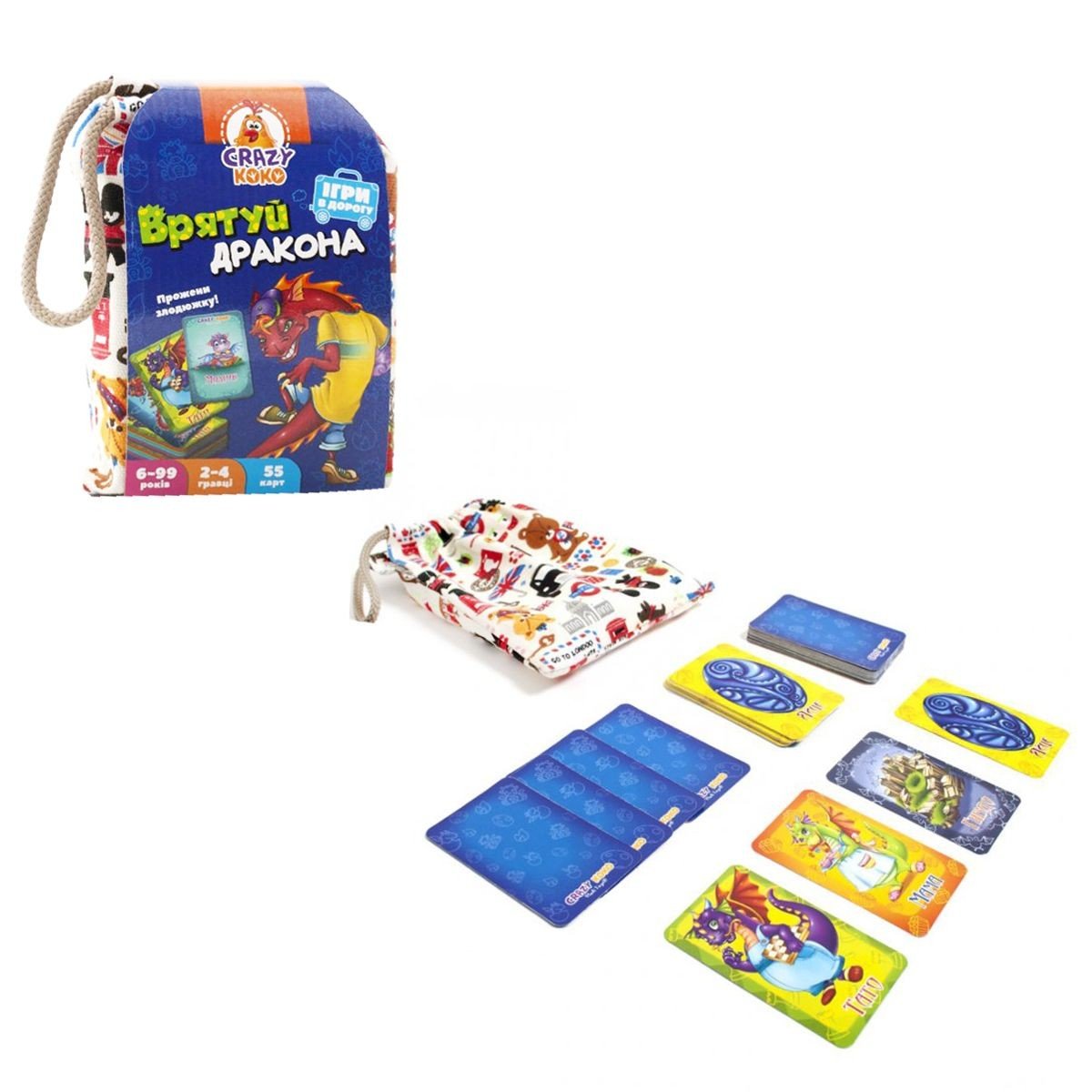 Захоплююча гра "Врятуй дракона" призначена для 2-4 гравців, віком від 6-ти років. Мета гри: керуючись правилами гри, першим зібрати 3 карти драконів-малюків. У комплекті: тканинний мішечок, 55 карток та інструкція. Розмір картки: 9 х 6 см. Колір і дизайн мішечка попадається рандомно.