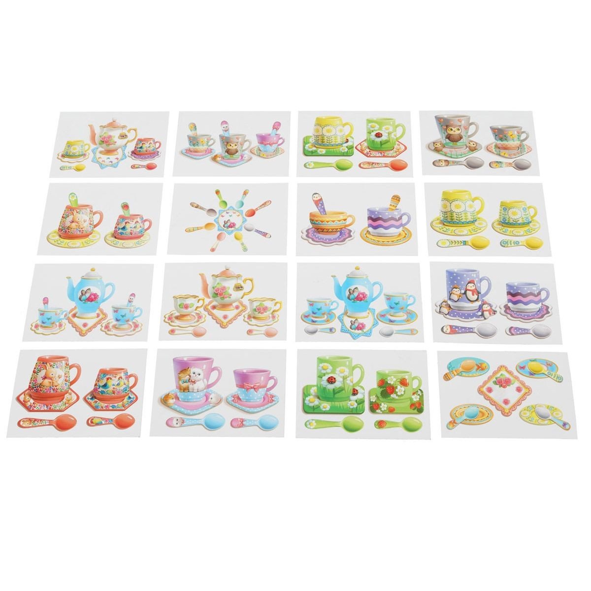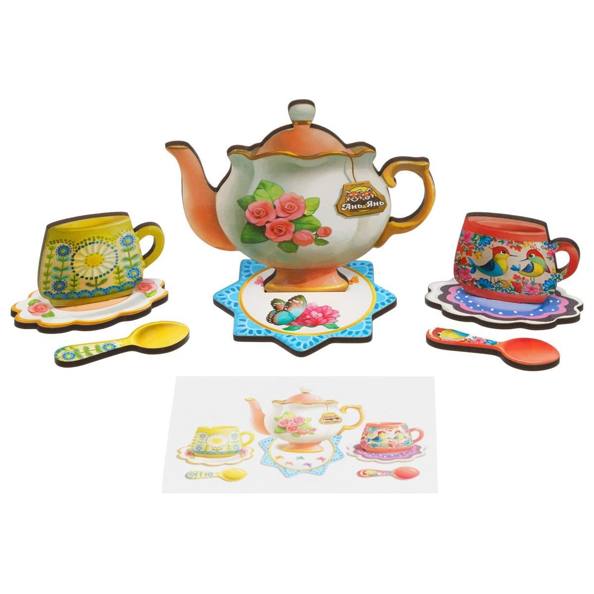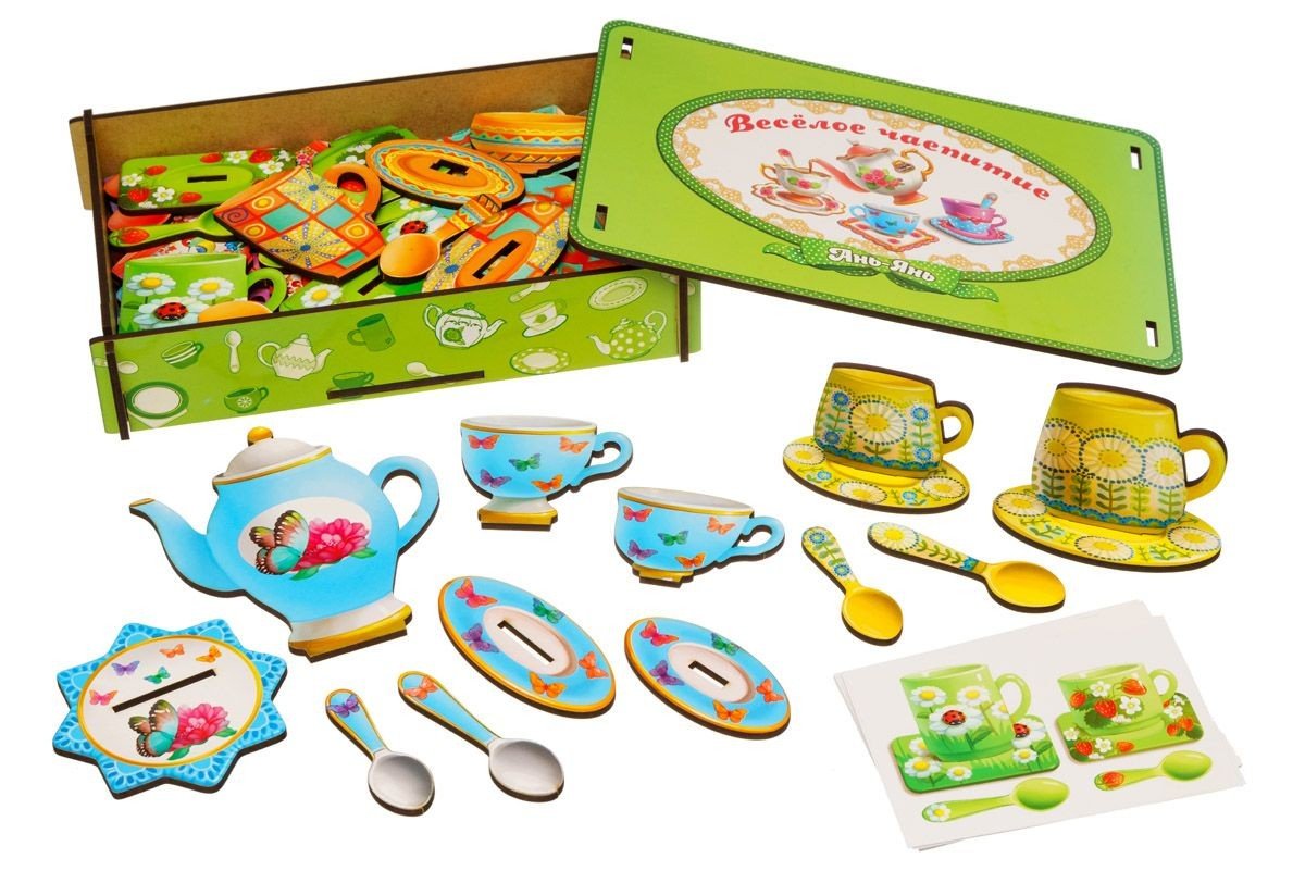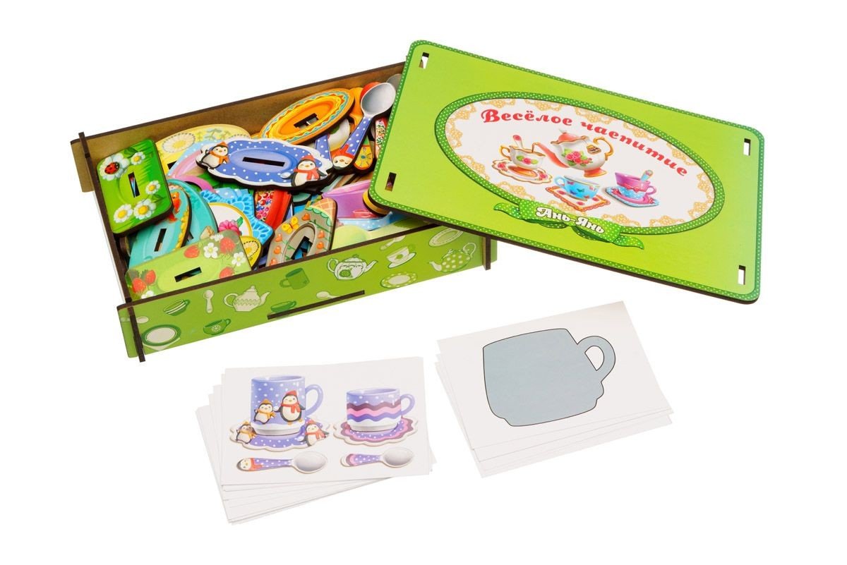 У комплекті: 20 чашок різного розміру, 2 чайничка, 22 блюдця, 20 ложечок. Дитині необхідно підібрати до чашок їх блюдця та ложечки за індивідуальним малюнком. Також у наборі йдуть 32 картки з різними завданнями для сортування за подобою. Гра допоможе вивчити поняття " великий та маленький".