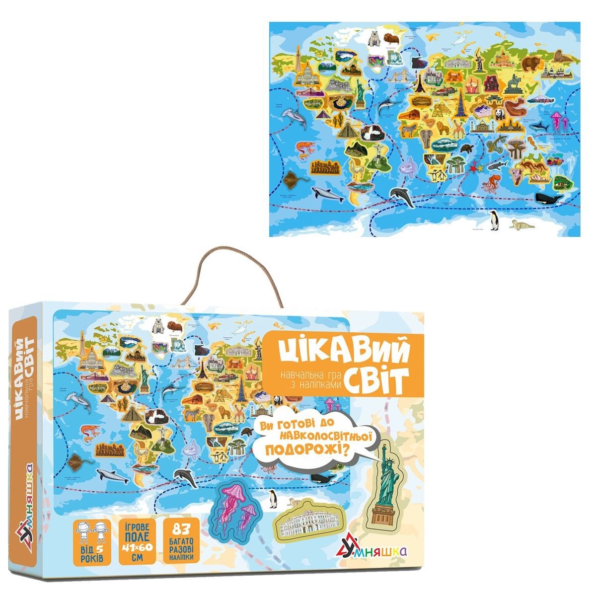 Цікава гра "Дивовижний світ" порадує малюка, а також поповнить скриньку знань цікавими фактами. На постері можна розміщувати наклейки багаторазового використання. Розмір ігрового поля (постера) - 41х60 см.