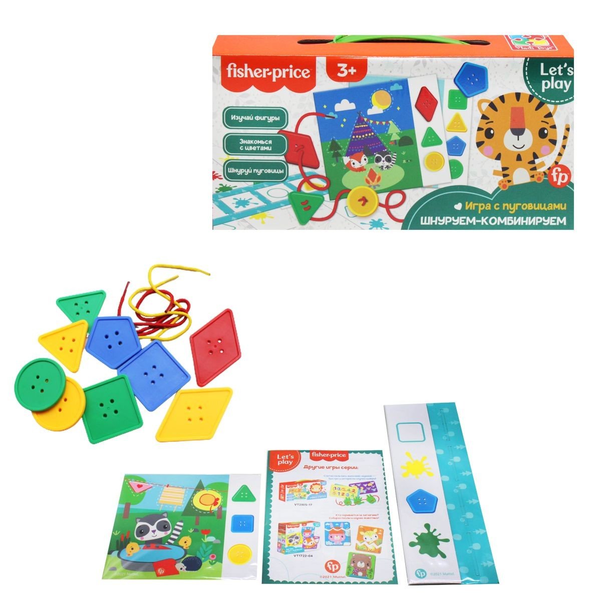 Мова: Російська Упаковка: Коробка Колір: Різнокольоровий Вага з упаковкою: 190 г Габарити в упаковці: 12 x 25 x 5.5 см Країна виробник: Україна Матеріал: Комбінований Комплектація: 12 карток із завданнями, 10 пластикових гудзичків, 1 комбінатор, 2 шнурочки, 1 інструкція
