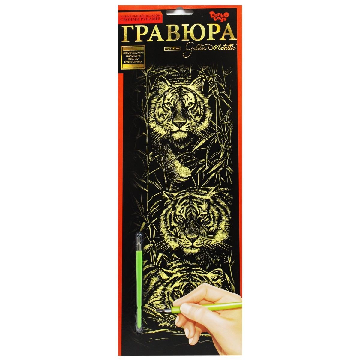 Гравюра "Golden metallic". За допомогою штихеля необхідно провести по контуру малюнка лінії, поступово створюючи зображення. У набір входить: основа з нанесеним контуром, спеціальний штихель (пластикова ручка-гравер з металевим наконечником), інструкція. Розмір готової роботи: 297 х 210 мм.