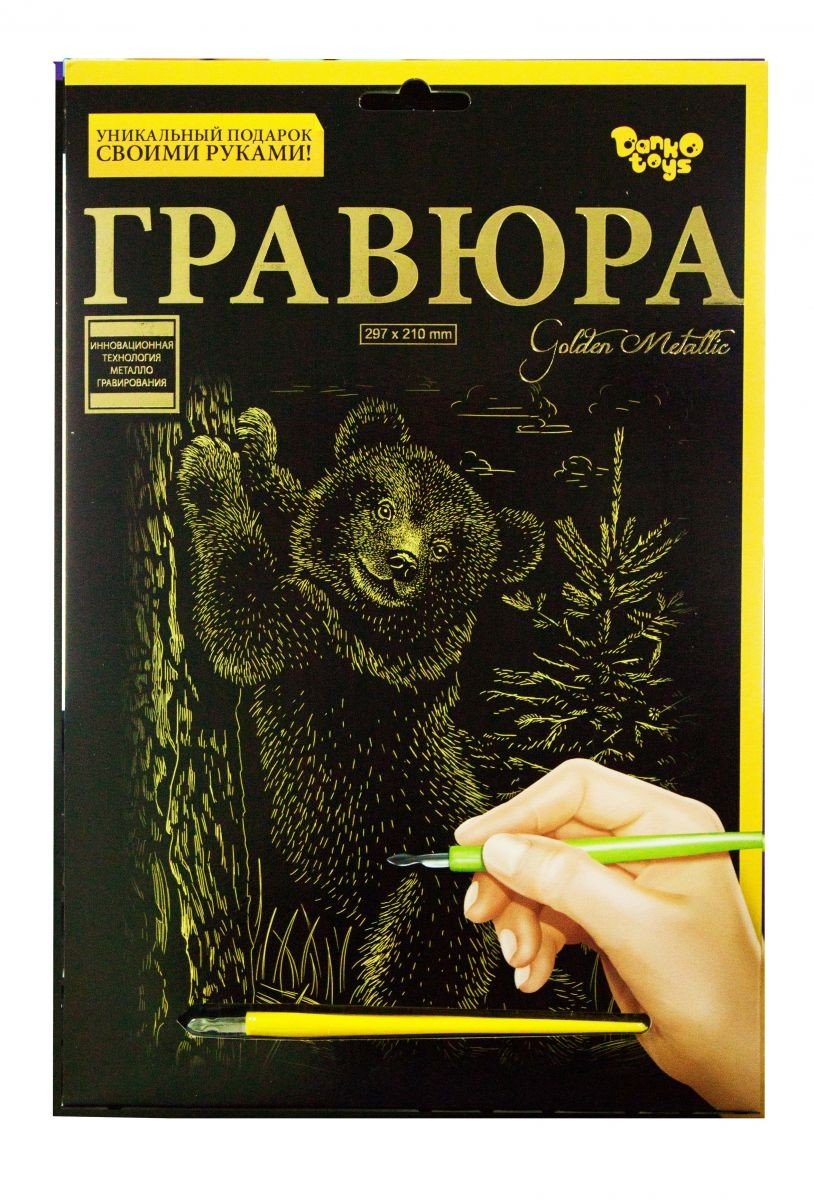 Гравюра "Golden Metallic: Ведмідь" (А4). За допомогою штихеля можна провести по контуру малюнка лінії, поступово створивши зображення. В процесі роботи розвивається кисть, вигострюються руху пальців. У наборі: основа з нанесеним контуром, штихель. Розмір готової роботи: 30 х 21 см.